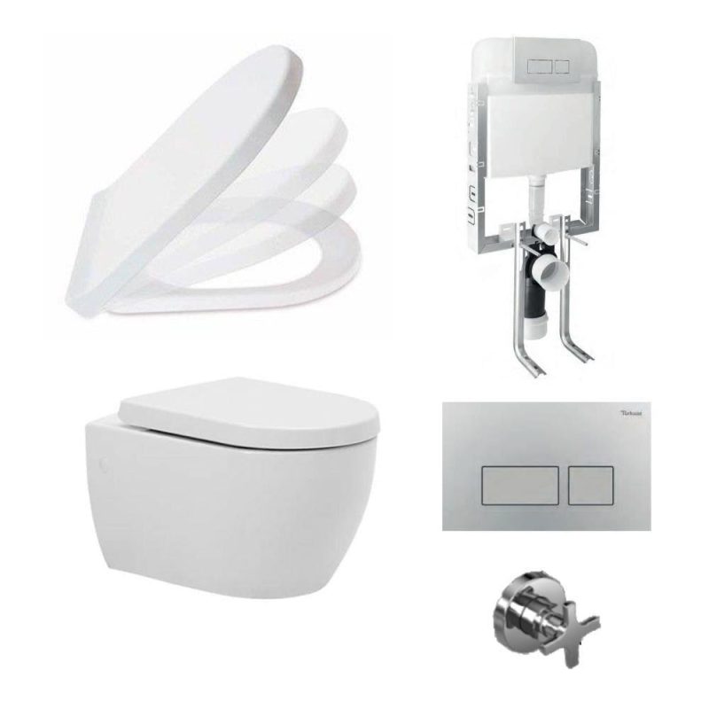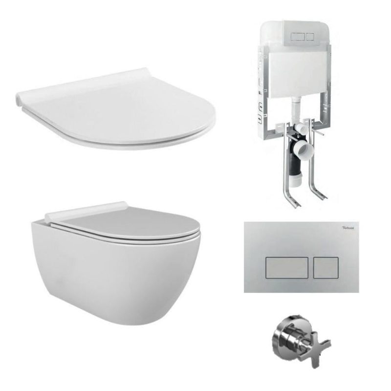 Turkuaz City Rimless Вградена висечка тоалетна са сет за пълнене на резервоара и капак от перла.