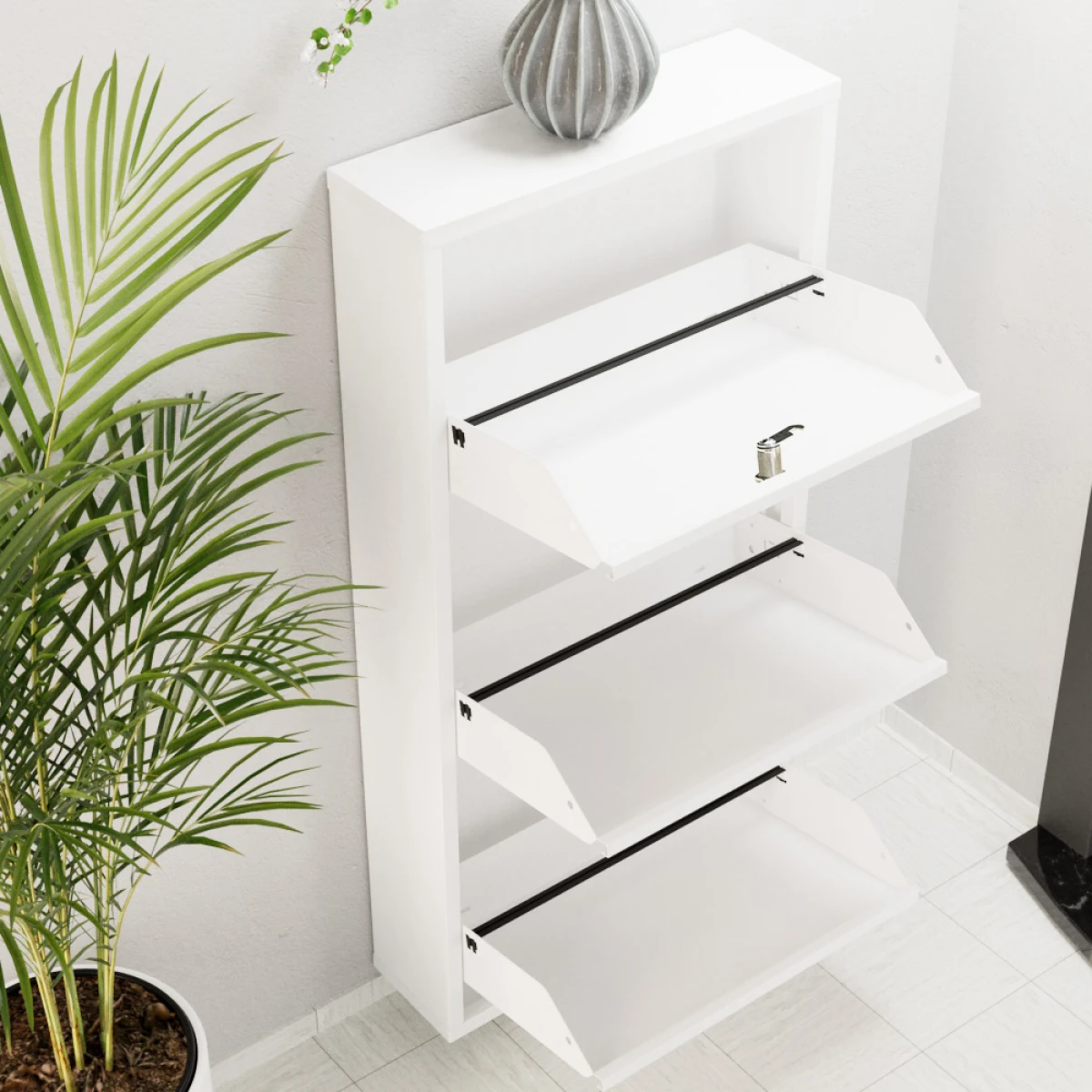 Заклучен Метален Ормар за Чевли со 3 Врати, со својот елегантен бел дизајн, му дава модерен и уреден изглед на влезниот простор во вашиот дом. Благодарение на заклучувањето, можете безбедно да ги чувате вашите чевли. Вратите со централно отворање се фиксирани со магнетни држачи, обезбедувајќи стабилна и удобна употреба. Со електростатска печена боја отпорна на рѓа, е долготраен. Опремата за фиксирање на ѕид се испраќа заедно со производот.