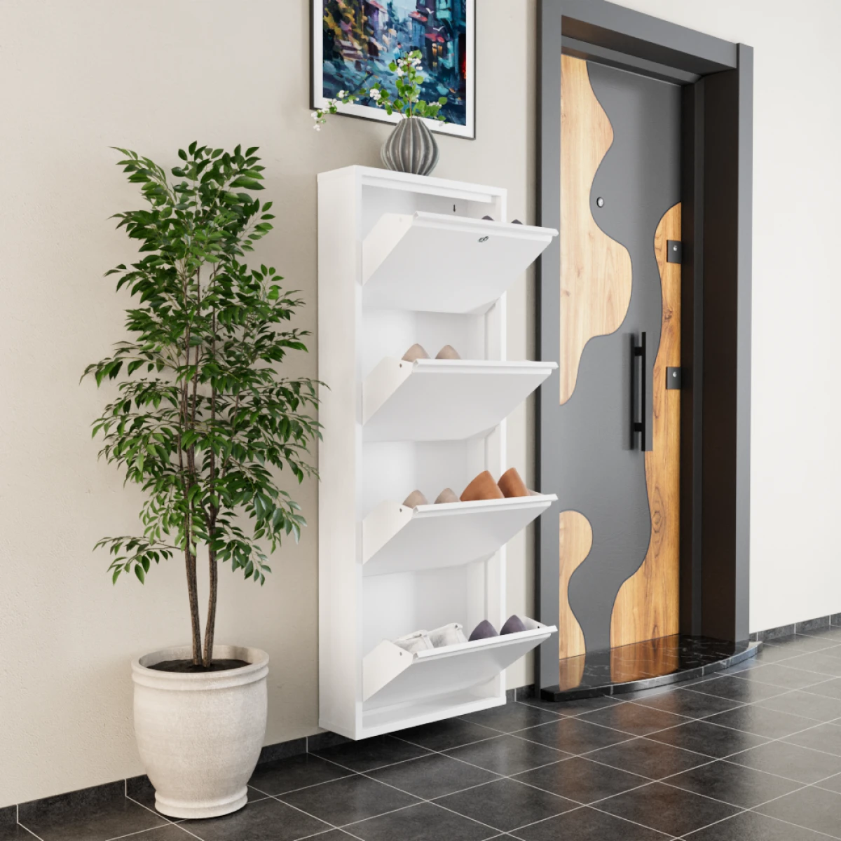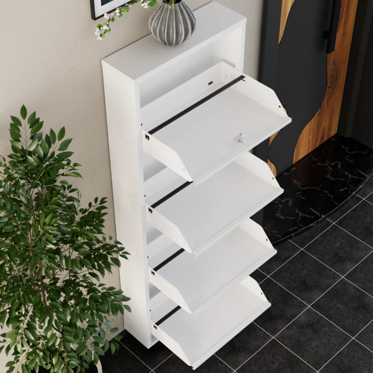 Заклучениот Метален Ормар за Чевли со 4 Врати, со својот модерен бел дизајн, обезбедува ред и безбедност во влезниот простор на вашиот дом. Благодарение на структурата со четири врати, можете лесно да ги организирате вашите чевли, а со централно отворање на вратите и магнетни држачи, можете да обезбедите стабилно и безбедно отворање и затворање на вратите. Металното тело покриено со електростатска печка боја отпорна на ‘рѓа нуди долготрајна употреба. Опремата за прицврстување на ѕидот се испраќа заедно со производот. Со заклучениот модел ги заштитува вашите предмети.