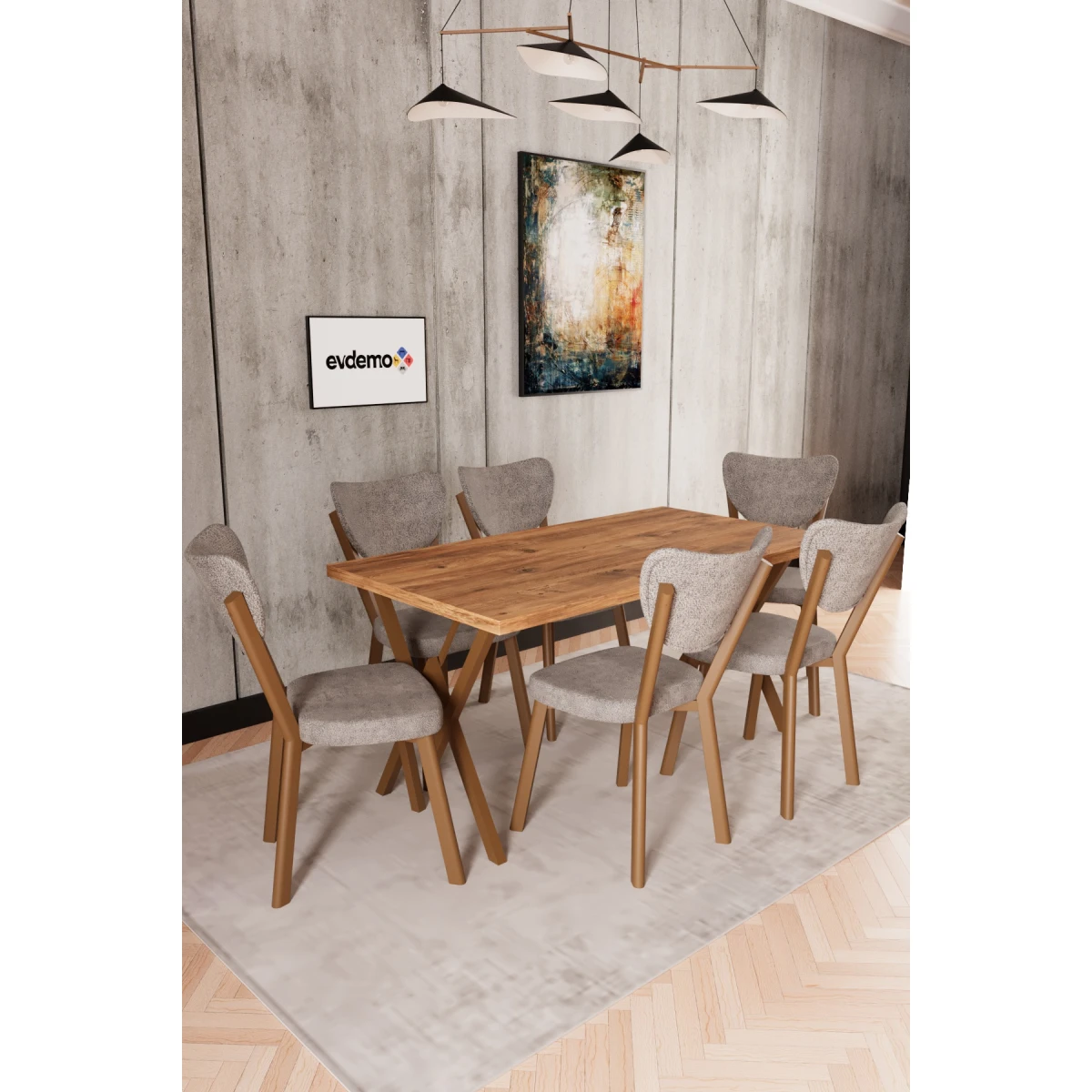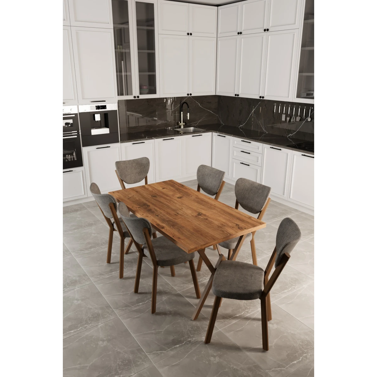 Комплетот Маса за 6 Лица Јаболко; со својот модерен кафеав дизајн, на вашите кујнски и трпезариски простори им дава елегантен и функционален изглед. Благодарение на издржливата метална конструкција на нозете и ергономските столчиња, нуди долготрајна и удобна употреба.