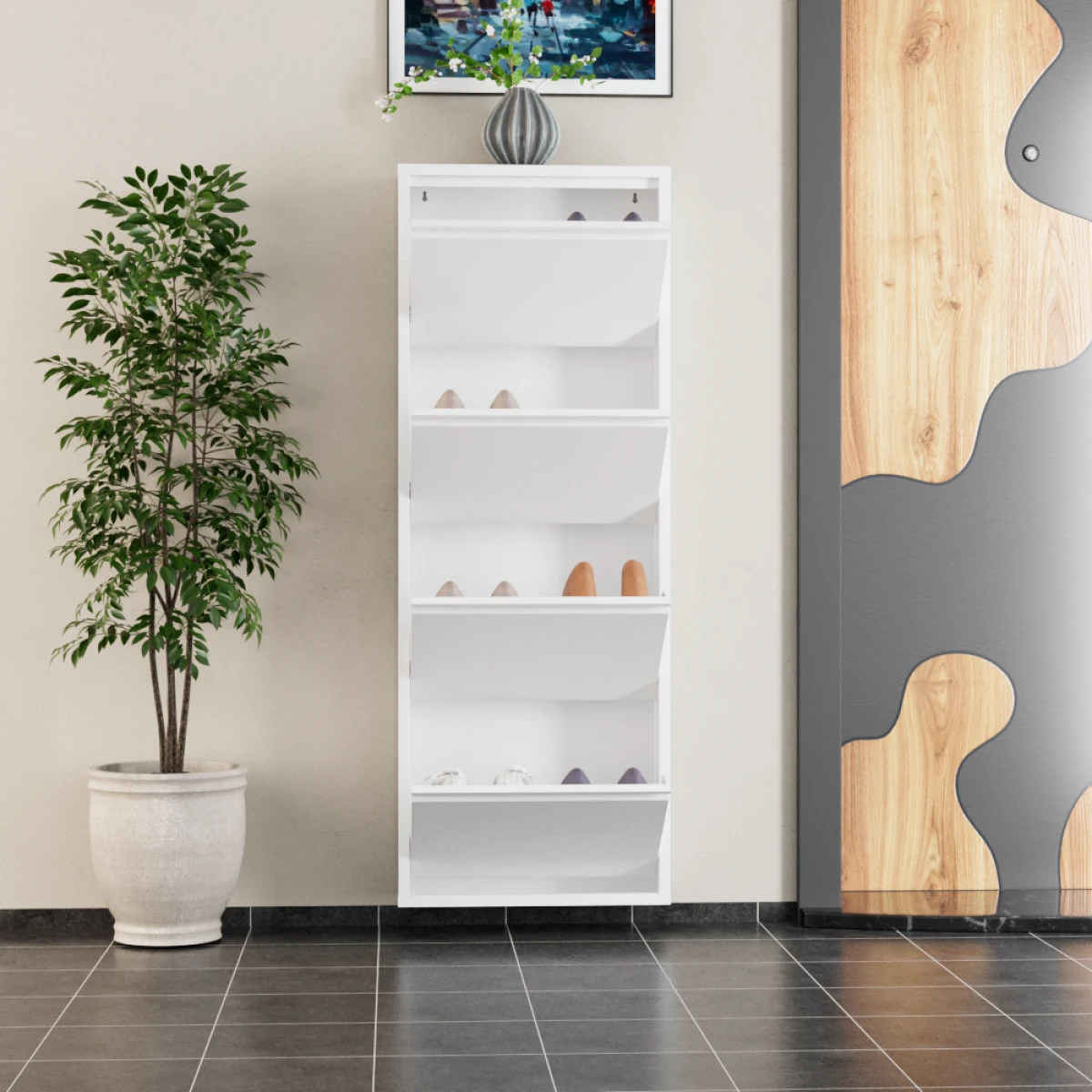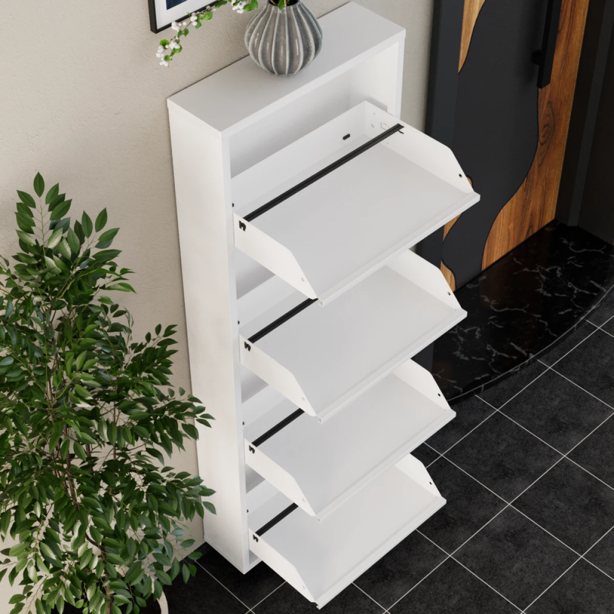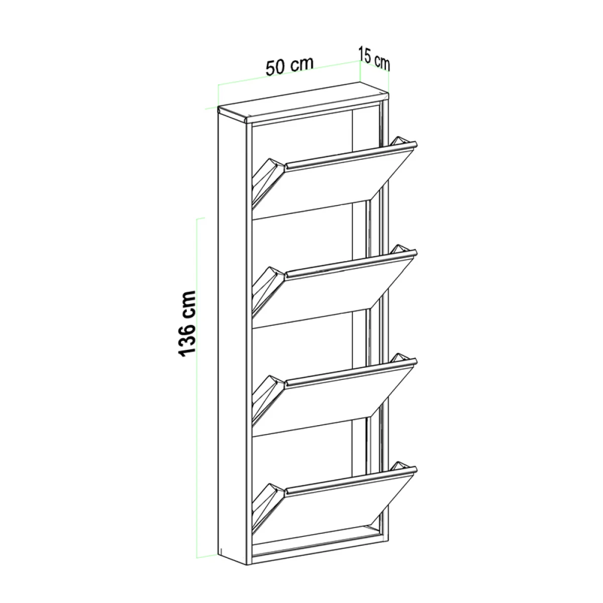 Металниот шкаф за чевли со 4 врати, со својата бела боја и едноставен дизајн, нуди уредна и елегантна употреба во влезните простори. Благодарение на неговиот широк внатрешен простор со четири врати, ви помага да ги чувате вашите чевли уредно. Вратите со централно отворање и магнетните држачи овозможуваат вратите да се отворат и затворат стабилно и балансирано. Металното тело обложено со електростатска печена боја отпорна на ‘рѓа е дизајнирано за долготрајна употреба. Производот се испорачува монтиран и подготвен за употреба, а опремата за прицврстување на ѕид е вклучена во пакетот.