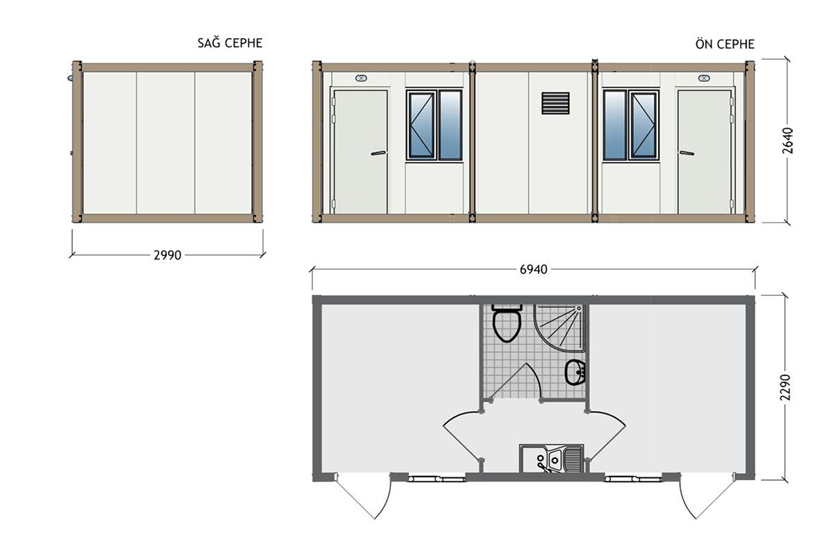 Овој модел на сендвич контејнер, кој нуди пространа и функционална употреба со својата структура со две соби, е дизајниран да одговара на животните и работните потреби со бања, тоалет и кујнска мијалник внатре. Благодарение на издржливата структура на сендвич панелите, нуди долготрајна употреба, додека системот со два влеза овозможува лесна употреба. Може да се користи како градилиште, канцеларија или животен простор.