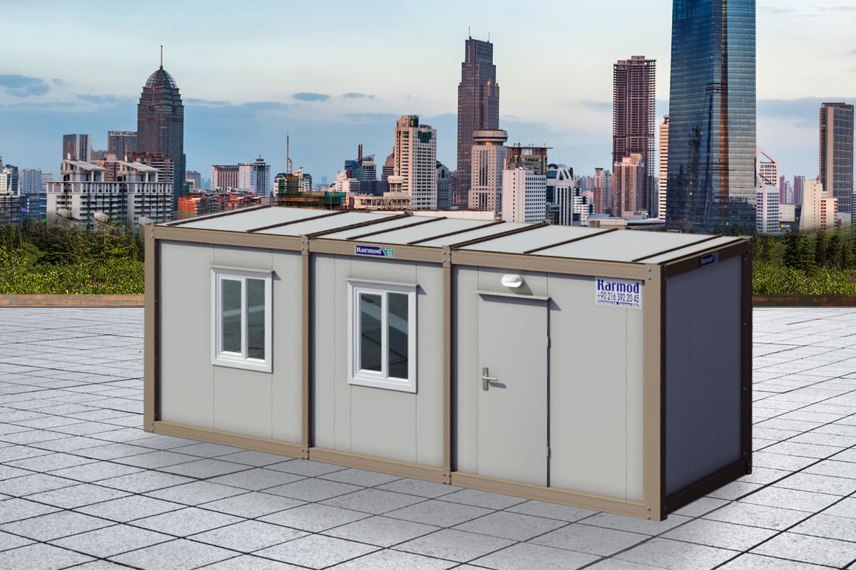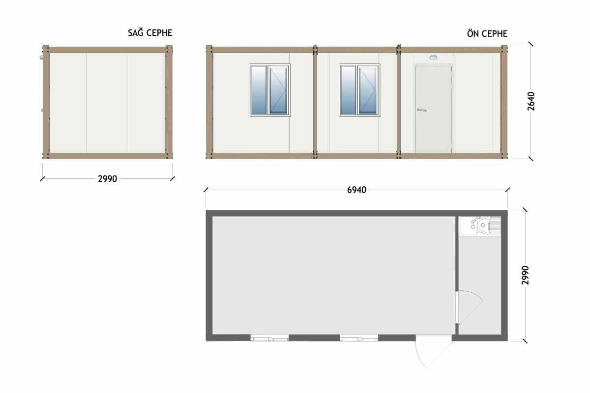 Моделот на сендвич контејнер со димензии 300×700 cm, кој располага со една соба и кујнски простор, е функционална структура дизајнирана за употреба како канцеларија и како животен простор. Внатре има посебна соба и кујнски дел. Со два прозорци и една врата, нуди светол и практичен внатрешен простор. Благодарение на издржливиот систем од сендвич панели, претставува долготрајно, преносливо и брзо монтирано решение.