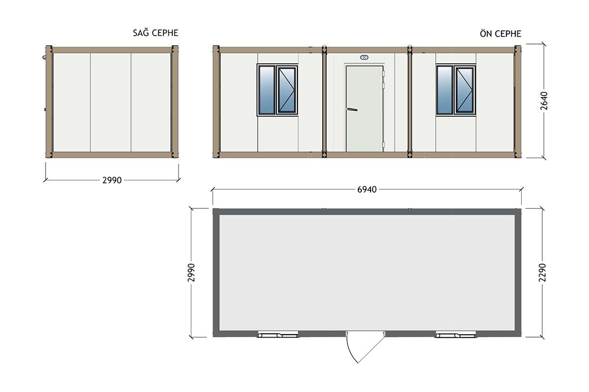 Моделот на офис контејнер со димензии 300×700 см, изработен од сендвич панели, нуди практично, економично и брзо решение за градилишта, теренски канцеларии и привремени работни простори. И покрај неговата компактна структура, овој модел обезбедува ефикасен внатрешен простор за употреба и може лесно да се користи во различни проекти благодарение на неговата издржлива материјална структура и преносливост.