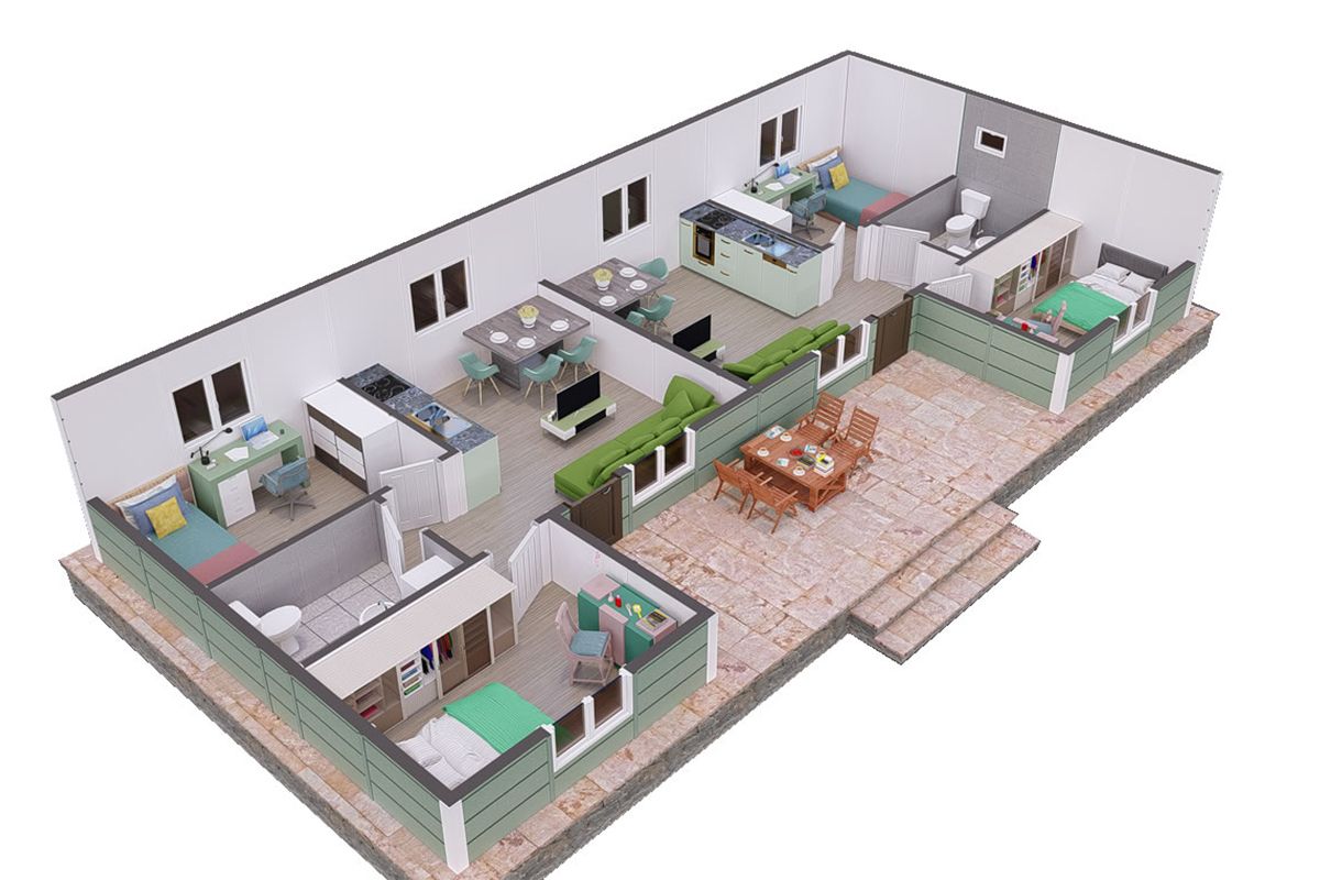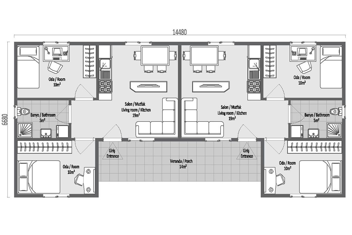 Еднокатната 3+1 челична префабрикувана куќа со површина од 101 m² е дизајнирана како издржливо и практично решение за домување, кое одговара на потребите на модерниот живот. Благодарение на челичната конструкција, таа нуди долготрајна употреба. Со предноста на брзата инсталација, куќата е подготвена за кратко време и се испорачува комплетно со електрична, водоводна, тоалетна и кујнска инфраструктура.