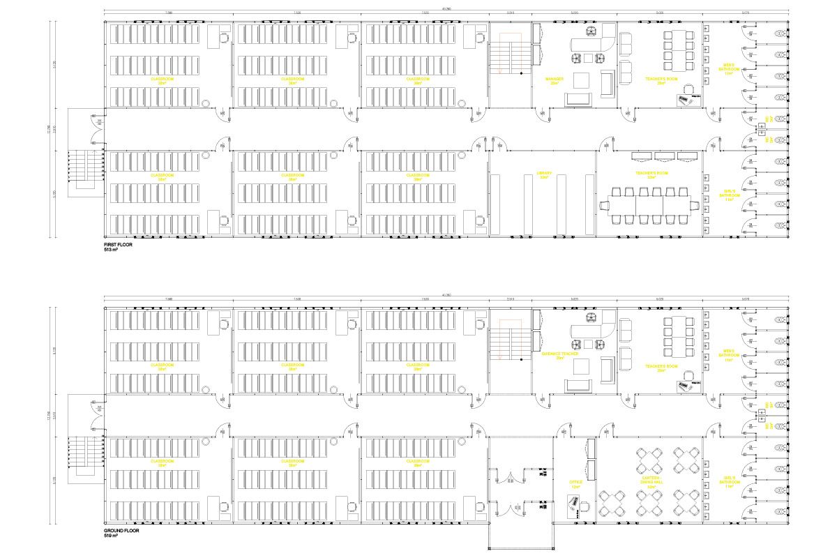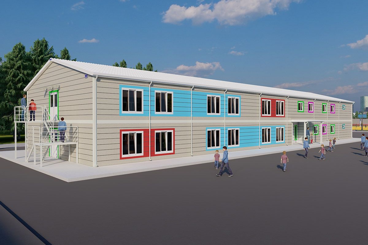 Моделот на префабриковано училиште од 1032 m² нуди широко, безбедно и модерно решение за образовни институции. Оваа структура, дизајнирана во согласност со планот за повеќекласна употреба, обезбедува идеален простор за училници, административни канцеларии, простории за наставници и социјални области. Со издржлива челична конструкција, висока изолациска перформанса и предност на брза инсталација, претставува долготрајно решение за образовни згради.