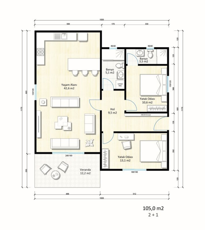 Моделот на еднокатна челична контејнерска куќа со површина од 105 m² нуди удобно живеалиште со својата издржлива структура и модерен дизајн. Благодарение на челичната конструкција, таа е долготрајна и безбедна. Во куќата, електричната енергија, водата, кујната и бањата се испорачуваат со подготвена инфраструктура и овозможуваат брза инсталација.