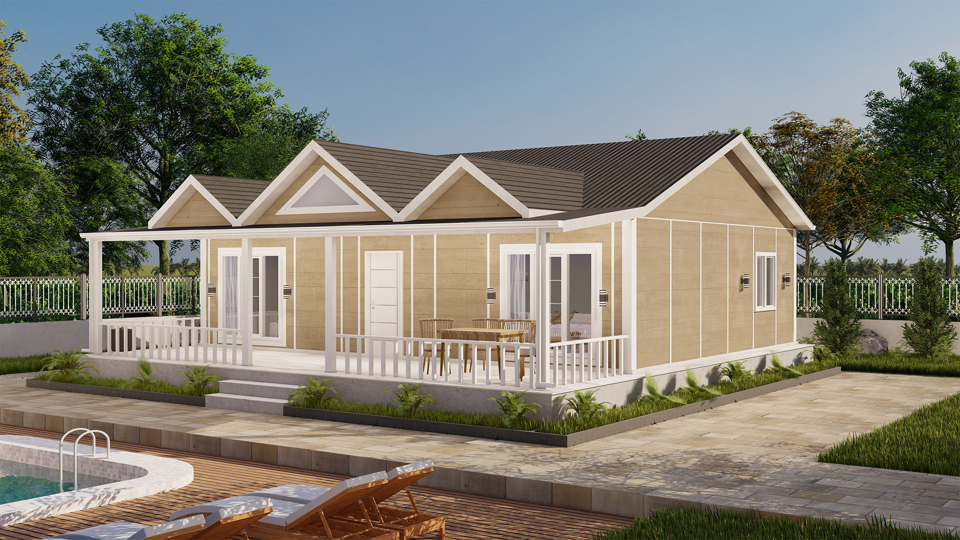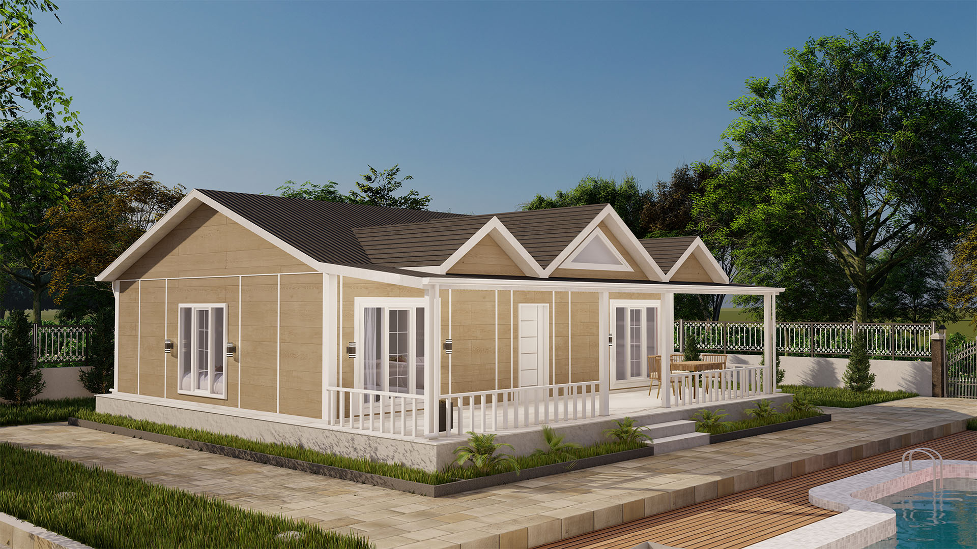 Со пространа веранда и функционална распределба на просториите, е идеална за мали и средни семејства. Обезбедуваме брза инсталација во регионите на Македонија, Косово, Србија, Албанија и Црна Гора.