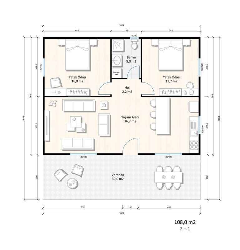 Моделот на еднокатна префабрикувана контејнерска куќа со корисна површина од 108 м² нуди комфорен животен простор со модерен дизајн и пространа распределба на просториите. Благодарение на префабрикуваната структура, обезбедува брза инсталација и преносливост. Внатре во куќата, електричната, водоводната, кујнската и бањската инфраструктура се подготвени и се испорачуваат за да обезбедат беспрекорно искуство при инсталација.