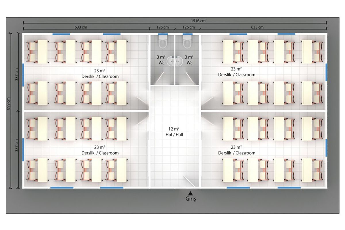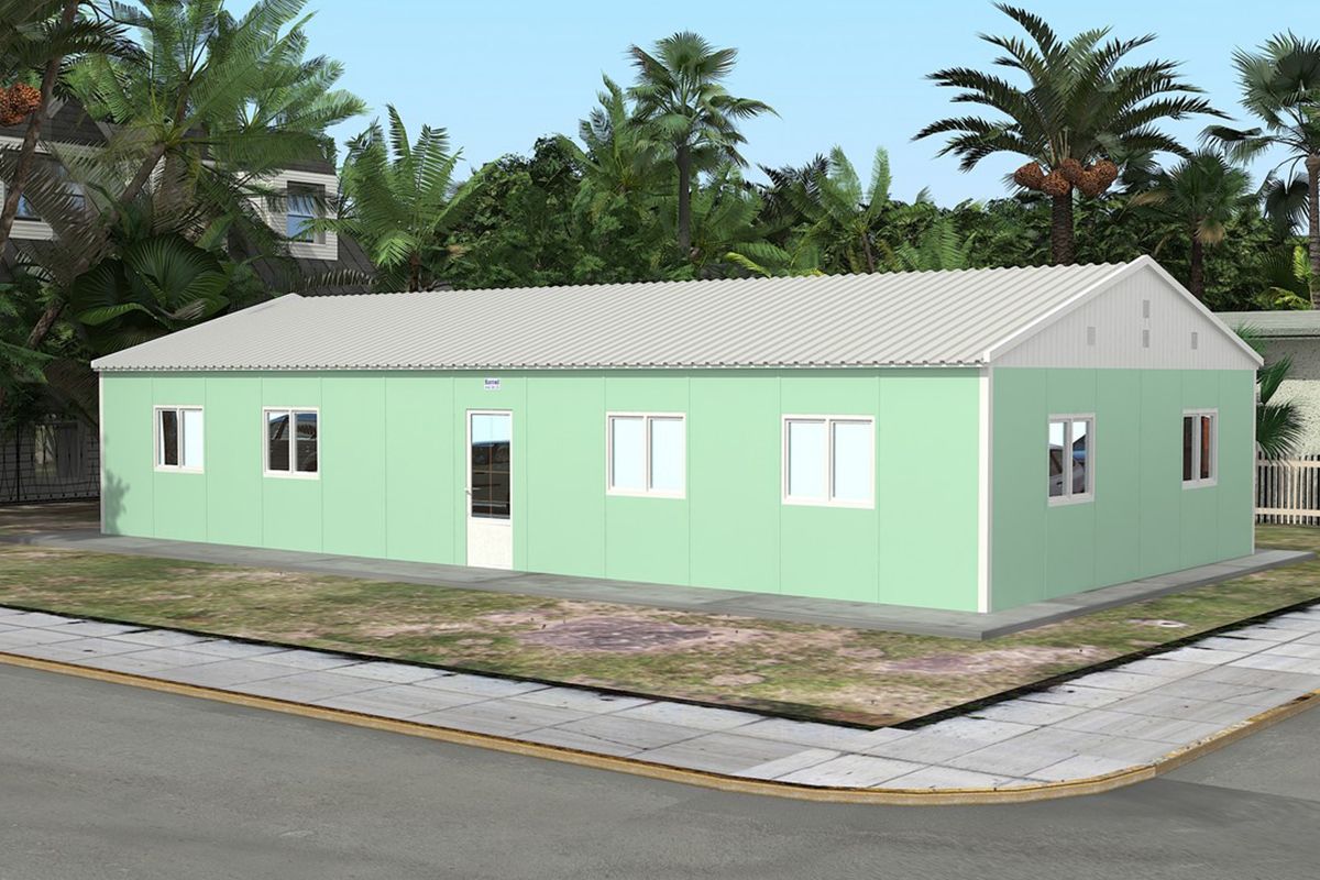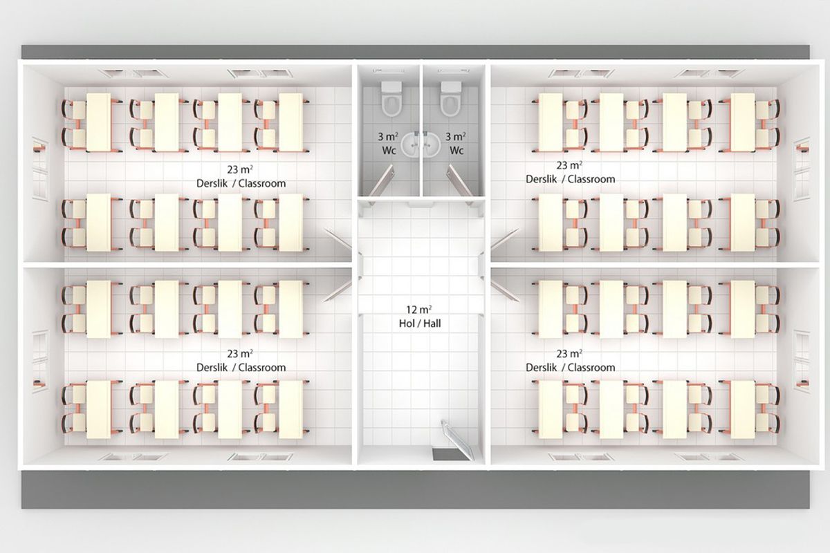 Моделот на префабрикувано училиште од 117 m² нуди брзо поставување, економично и издржливо решение за мали образовни потреби. Со своето планирање кое е погодно за училници и административни простори, обезбедува практична употреба за образовни институции.
