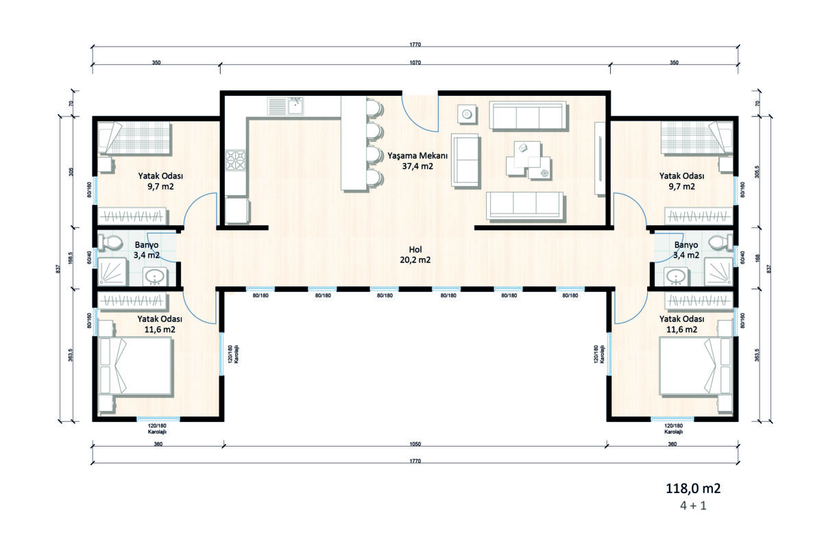 Моделот на еднокатна челична контејнерска куќа со корисна површина од 118 m² нуди безбеден простор за живеење со својот модерен и издржлив дизајн. Куќата се испорачува со подготвена инфраструктура за електрика, вода, кујна и бања, овозможувајќи брза инсталација.