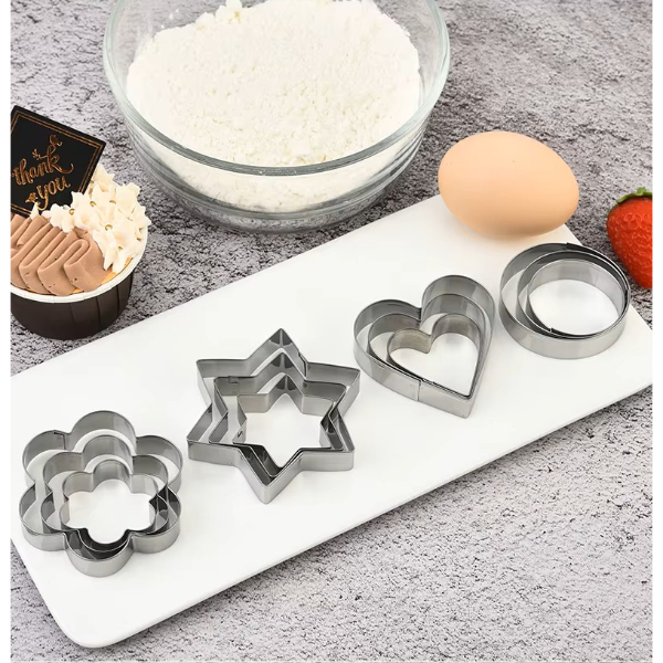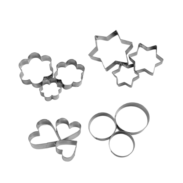 Сет на 12 парчиња калупи за колачи од не’рѓосувачки челик е идеален за креативно обликување на вашите колачи. Овој сет вклучува 12 парчиња со 4 различни форми: срца, ѕвезди, цветови и кругови, секоја во три различни големини.
