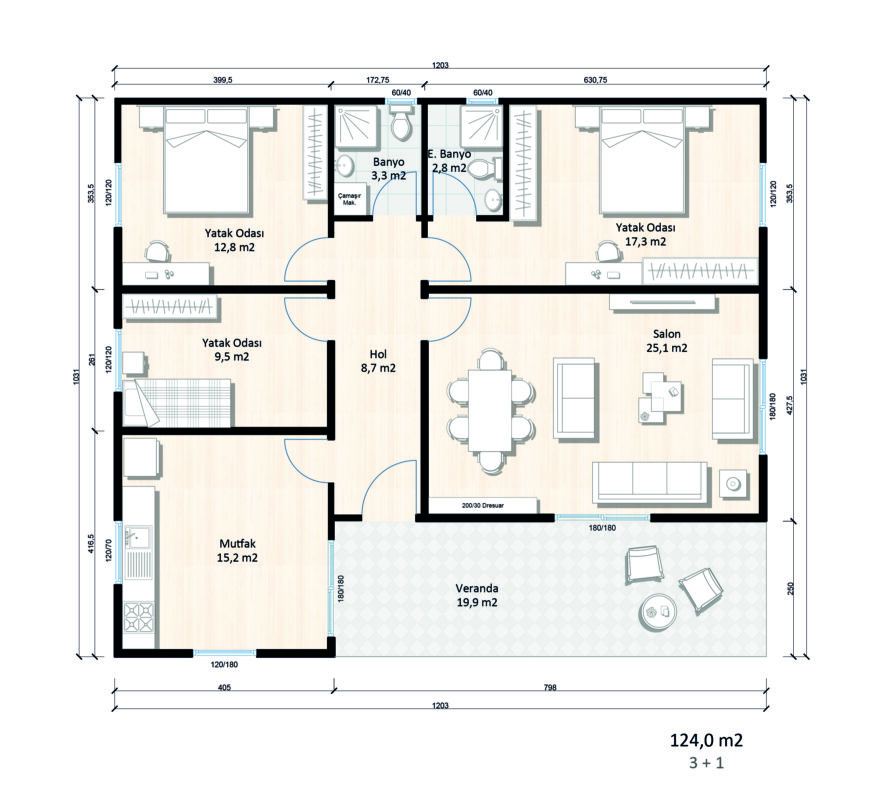 Еднокатната челична контејнер куќа со површина од 124 m² нуди безбеден простор за живеење со модерен дизајн и цврста структура. Внатрешноста на куќата се испорачува со подготвена електрична, водоводна, кујнска и бањска инфраструктура и се врши инсталација на лице место.