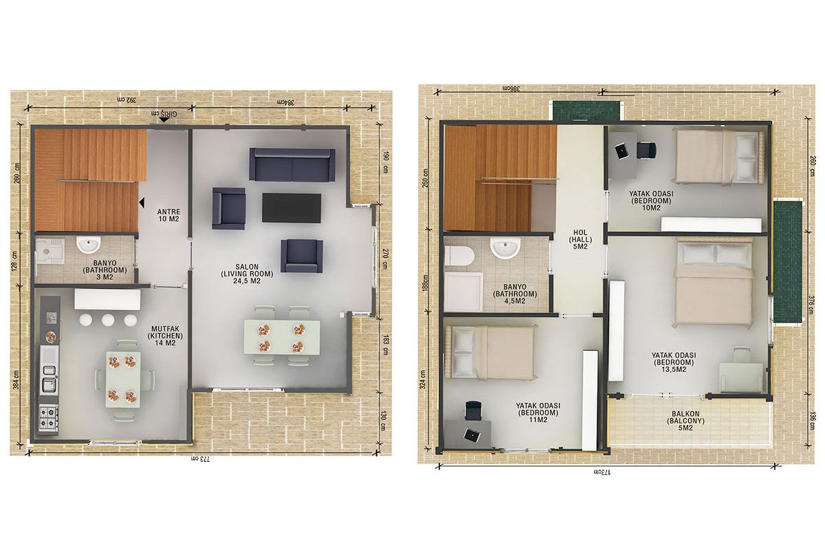 Нов тренд во изборот на домови е префабрикуваната вила. Иновативните дизајни се инспирирани од убавините кои се одразуваат во природата на домувањето. Една од најубавите синтези на модерното и традиционалното се остварува во моделот на префабрикувана вила од 124 m². Привилегиите на челичниот конструктивен носечки систем се одразуваат како широк простор во внатрешноста. Најдобрата ергономија на користење во пространи места нуди вистинска удобност за живеење. Во овој дом, каде што ќе зачекорите во безбеден живот со вашето семејство, ќе го најдете вистинскиот мир.