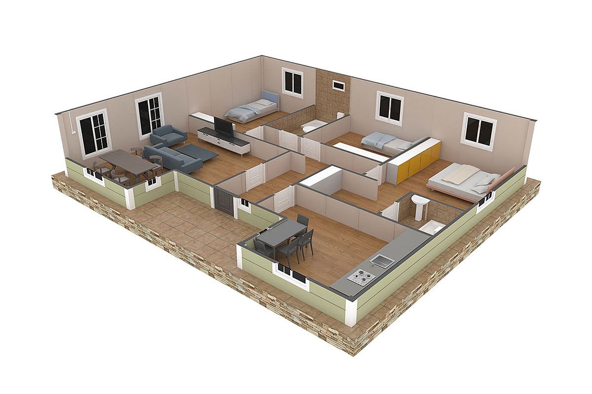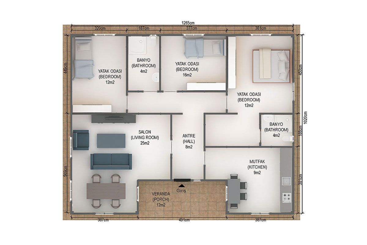 126 m² еднокатна префабрикувана куќа, со план 3+1, нуди пространа и комфорна животна средина. Со својата пространа дневна соба, практична кујна и големи простории, е дизајнирана да одговара на семејниот живот. Благодарение на својата еднокатна структура, обезбедува практична употреба, додека со модерната архитектура нуди естетика и функционалност во едно.