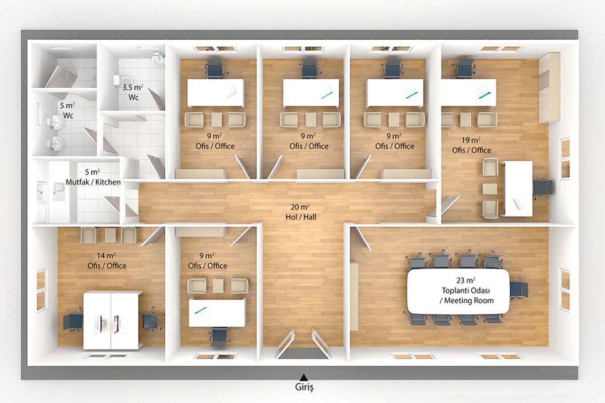 Моделот на префабрикан канцеларија од 136 m² е дизајниран да одговара на корпоративните потреби со својата широка употребна површина и модерен архитектонски пристап. Отворениот канцелариски распоред нуди флексибилни можности за планирање за управни простории и работни простори. Обезбедува долготрајна работна средина со брза инсталација, издржлив систем на градба и енергетска ефикасност.