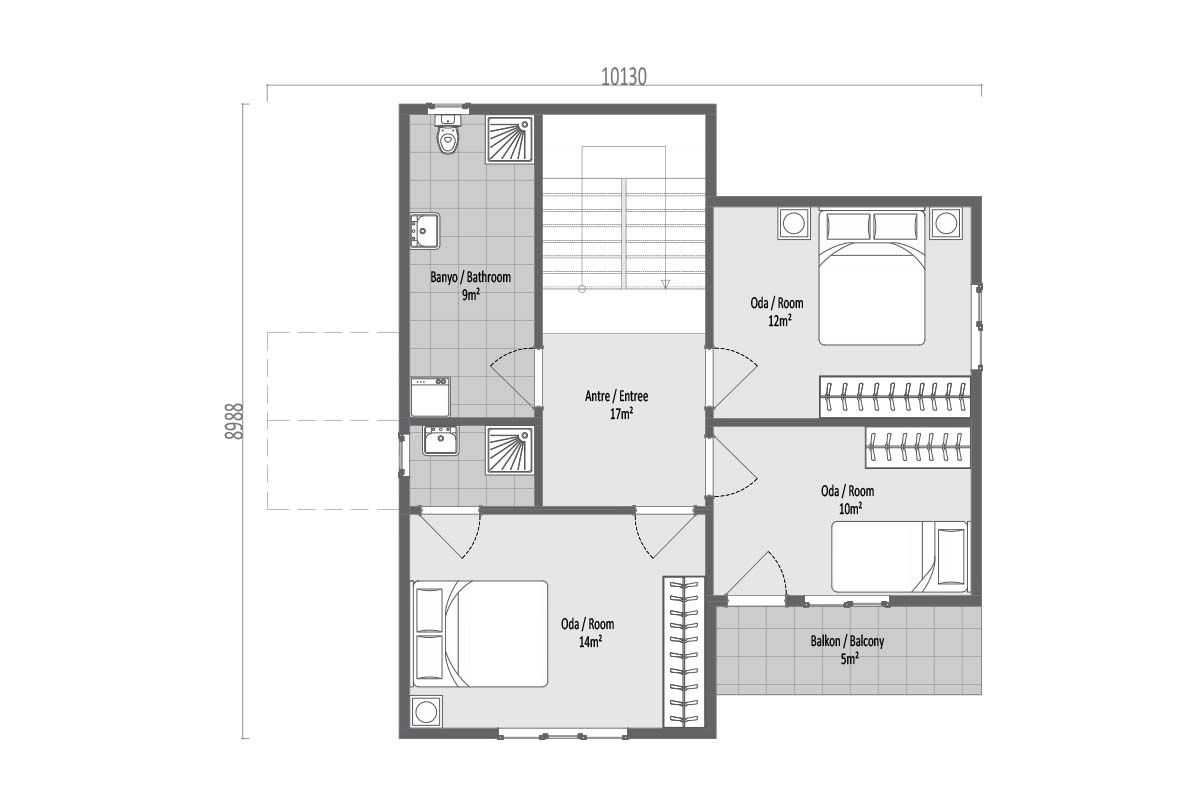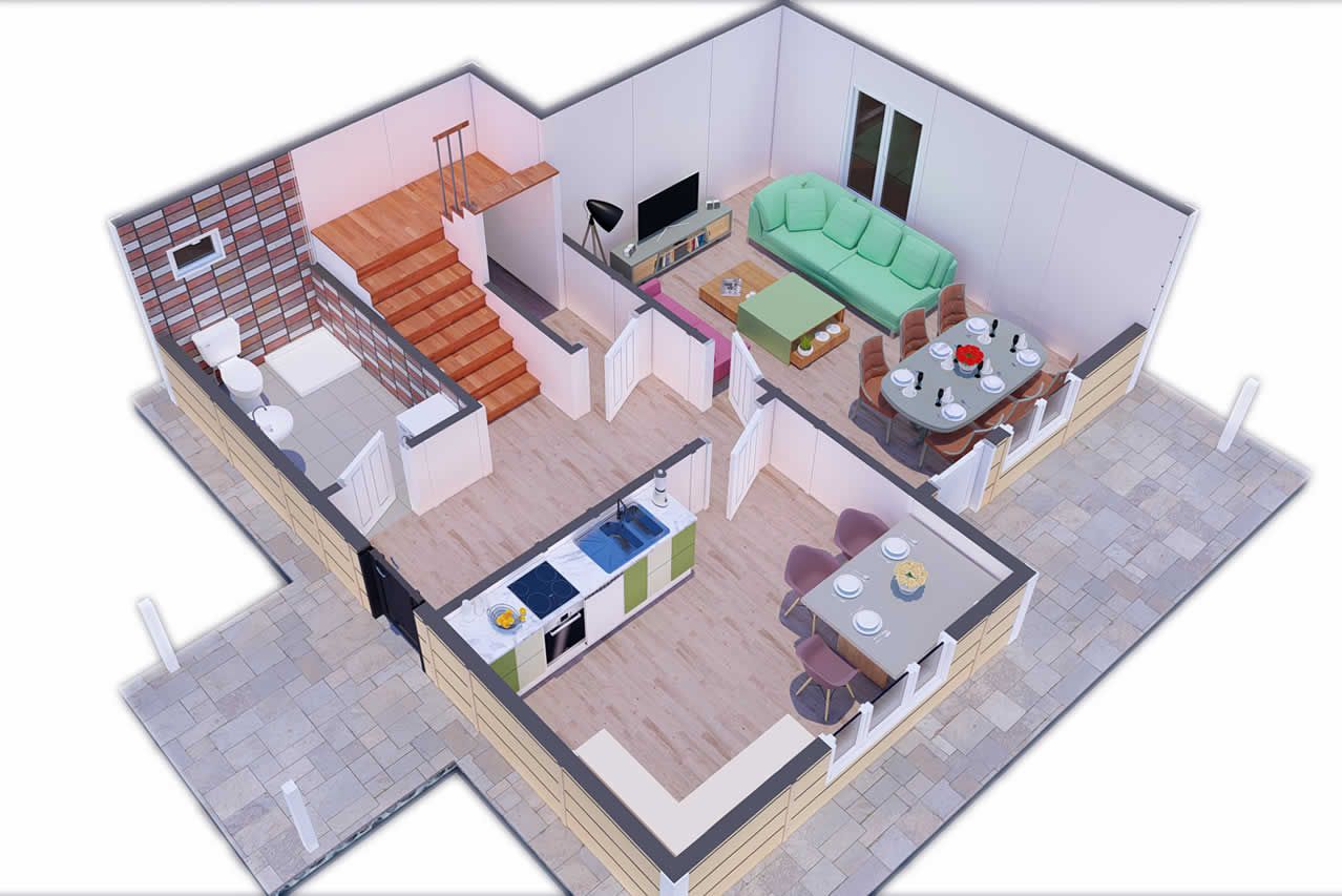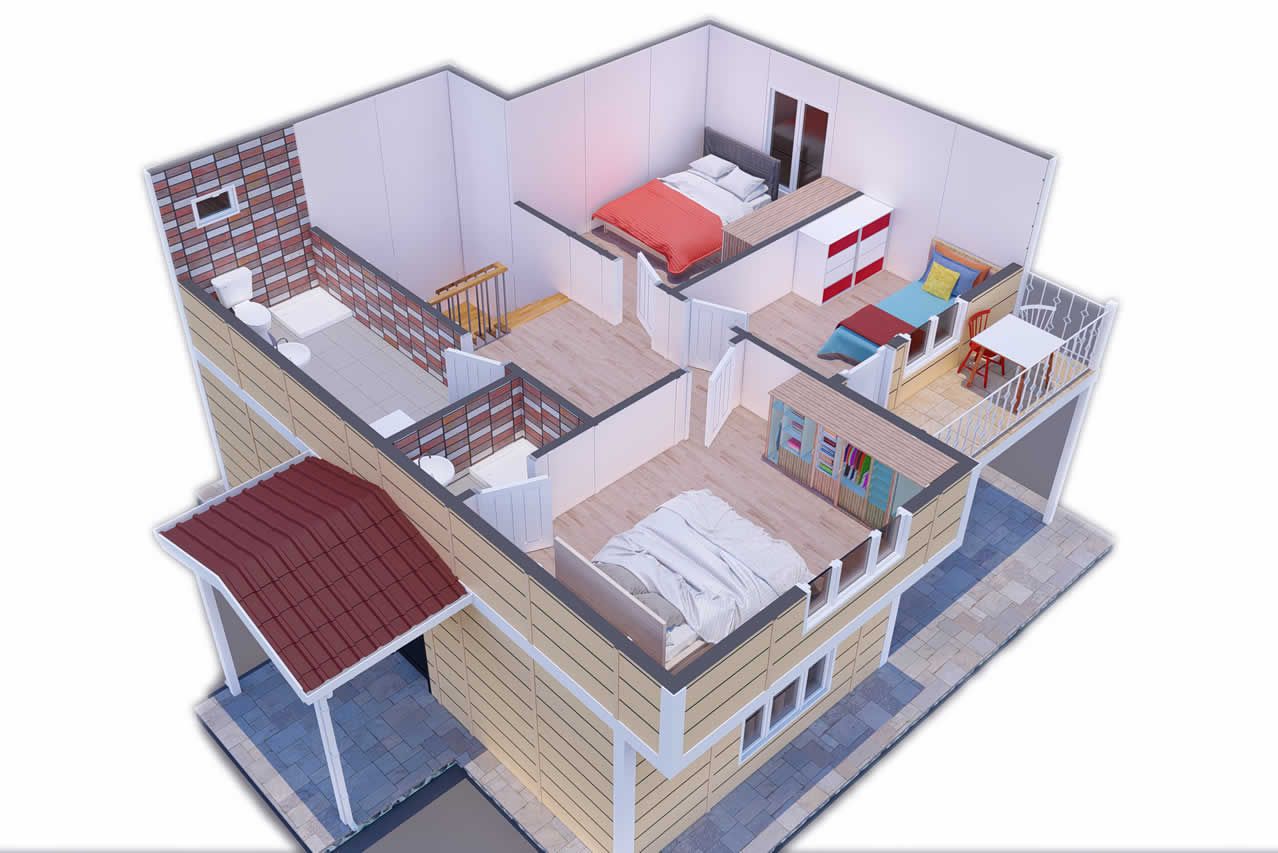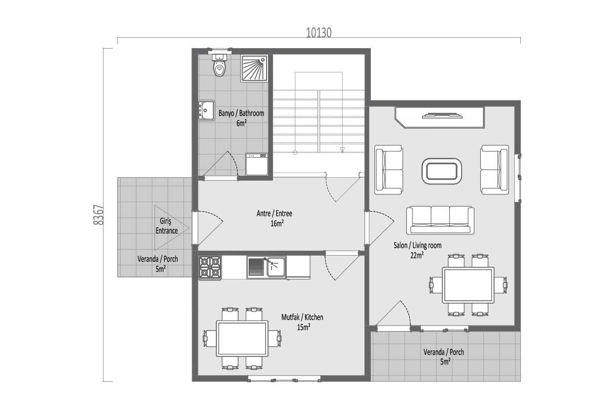136 m² префабрикуваната вила нуди комфорен живот со својот модерен и ергономски дизајн. Со планот 3+1 се создадени пространи и светли простори, а внатрешната распределба е планирана да одговара на семејниот живот. Со големите прозорци на предната фасада и користењето на верандата и балконот, се обезбедува максимална корист од дневната светлина. Оваа специјална префабрикувана вила ви нуди мирна и безбедна животна средина со својот естетски надворешен изглед и функционален внатрешен простор.