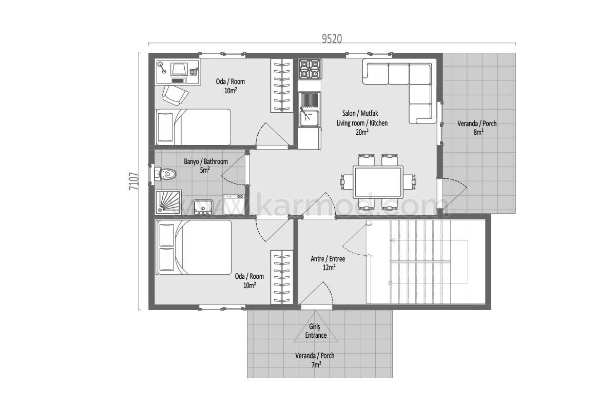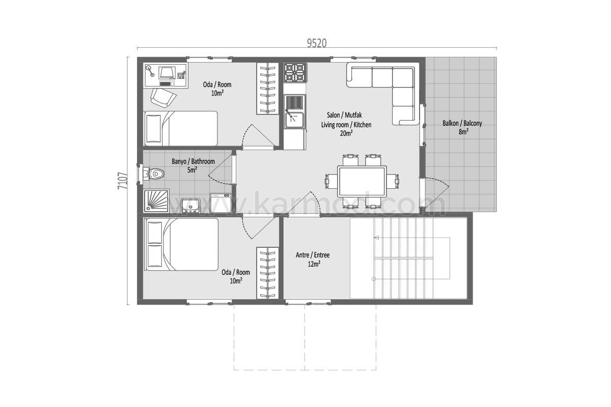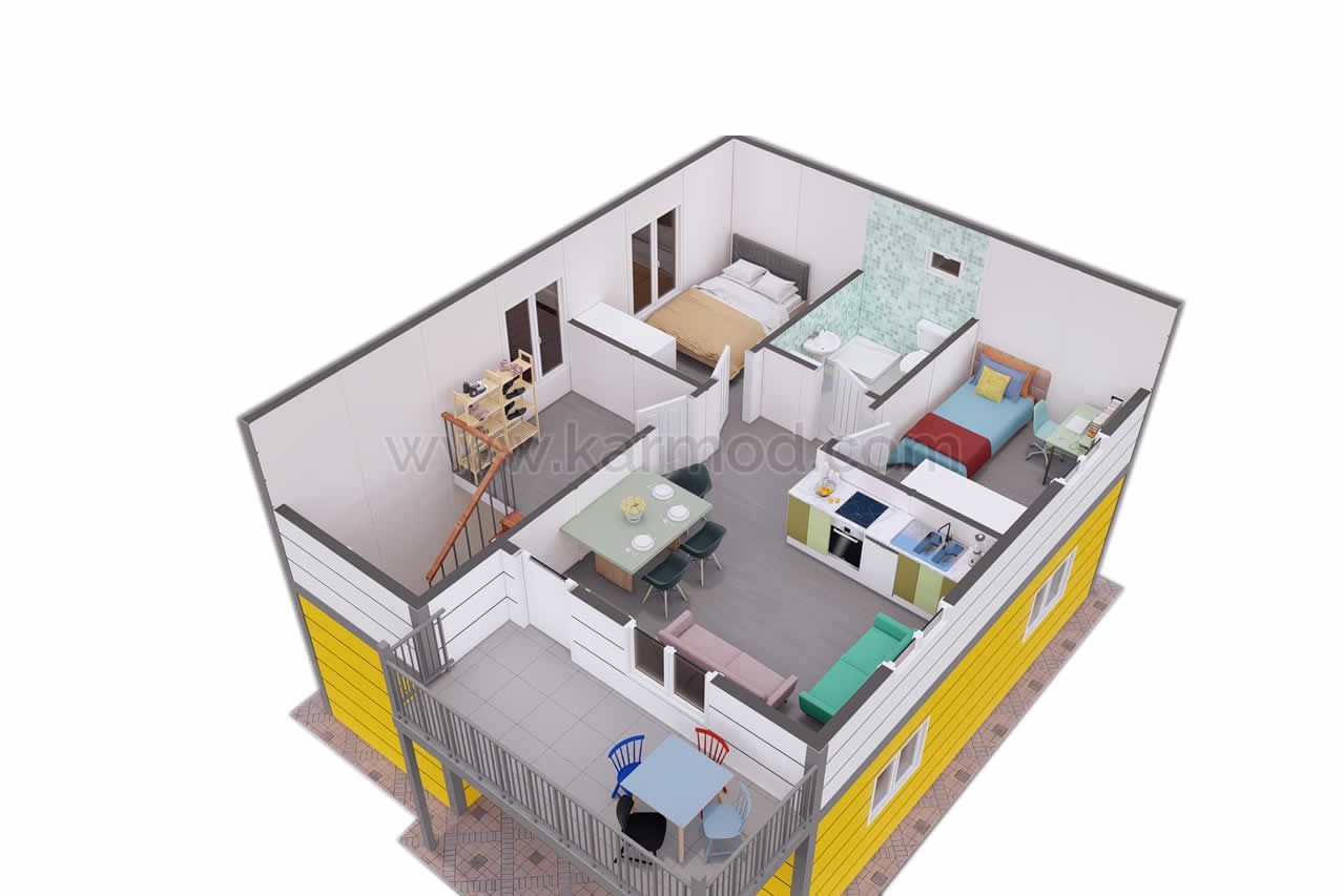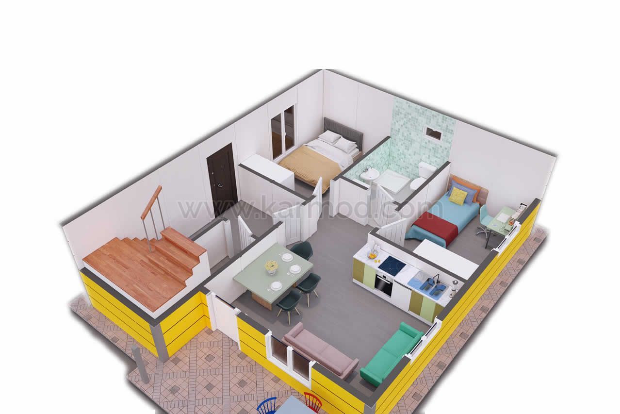 Оваа префабрик куќа, каде две одделни 2+1 апартмани се собрани под еден покрив, е специјално дизајнирана за споделување на среќата. Скали кои се поставени на влезот во заедничка употреба водат до врати кои се отвораат кон независни влезови на секој кат. Нуди предност да живеете во иста зграда како соседи со татко и син, браќа или семејни пријатели. Живеалиштето, планирано на основа од 69,5 м², достигнува 139 м² на два ката. Широките семејства можат да го користат живеалиштето како вила од 5+1.