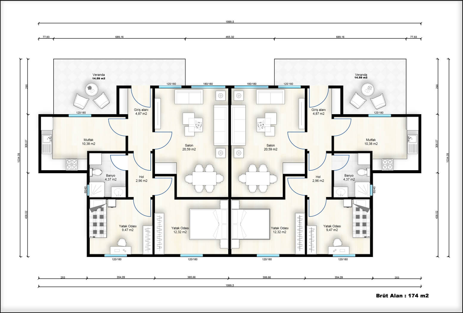 Еднокатната челична контејнерска куќа со површина од 174 m², со своите пространи животни простори и функционален дизајн, претставува идеално решение за модерен живот. Во куќата електричната, водоводната, тоалетната и кујнската инфраструктура се доставуваат подготвени и се нуди услуга за инсталација на лице место.