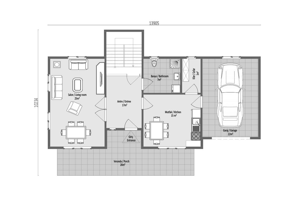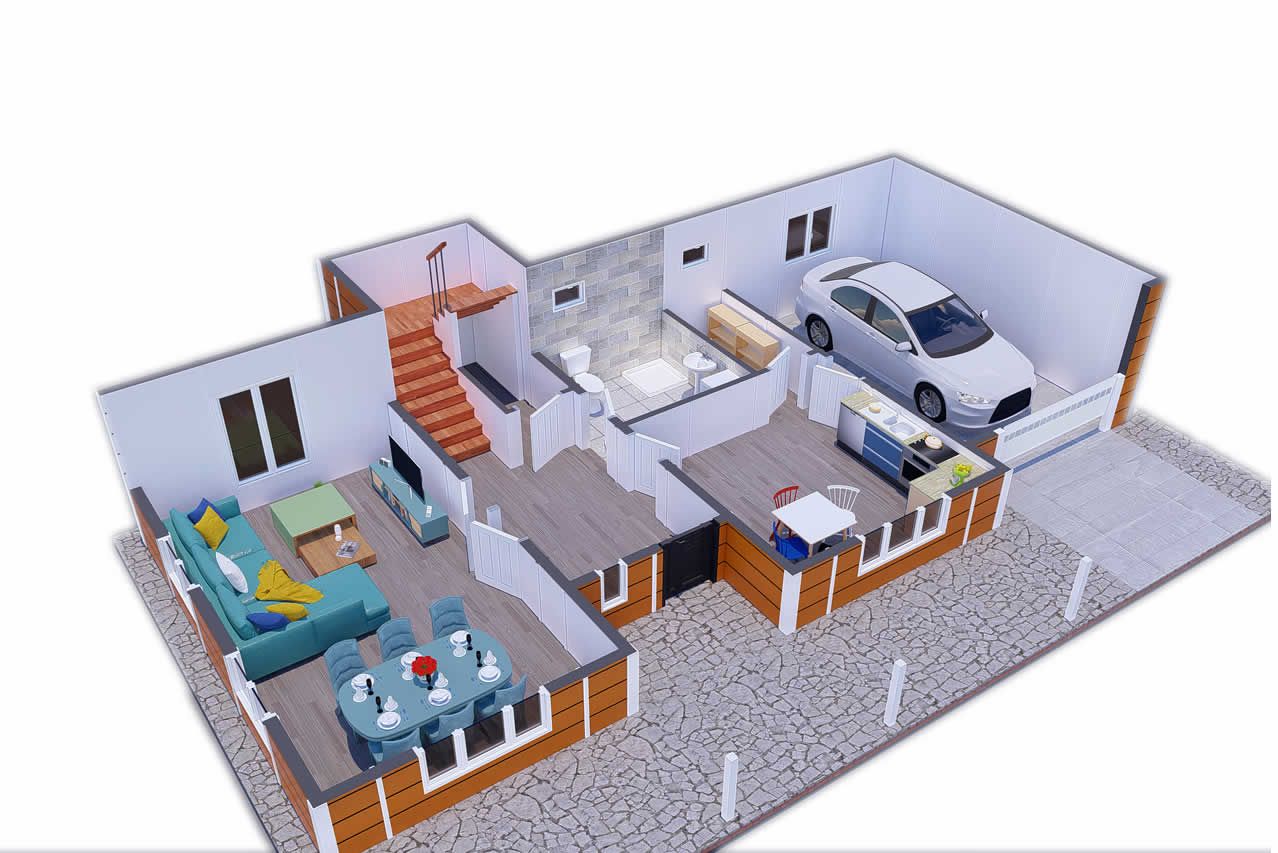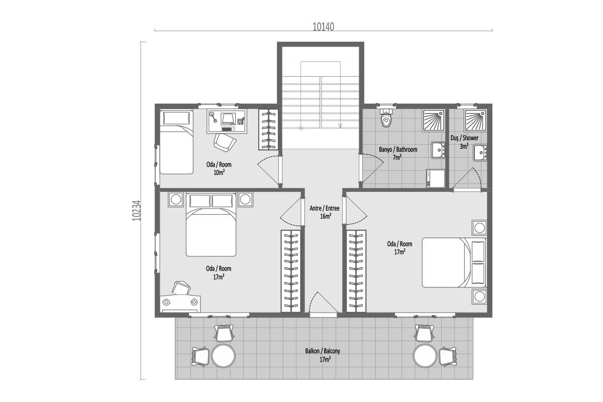 Максимална ширина на просториите во моделот на префабрикуваната вила од 196 m². Нуди мирен живот со челични носечки системи. Приземјето е резервирано за дневната соба и кујната, додека на горниот кат се наоѓаат две одделни големи спални соби кои создаваат мирна атмосфера за среќен живот. Големите соби на горниот кат се спојуваат со балкон по целата предна страна, зголемувајќи ја ергономијата. Вистински комфор на вила со пространи и светли простори за живеење во оваа куќа.
