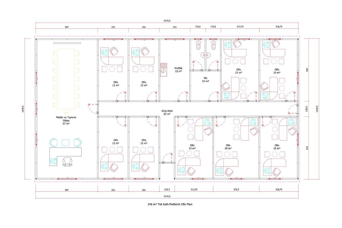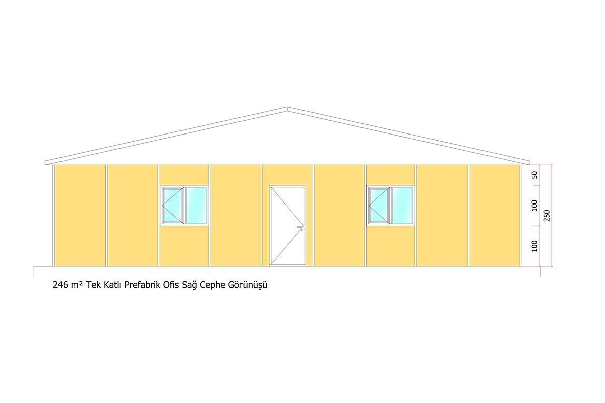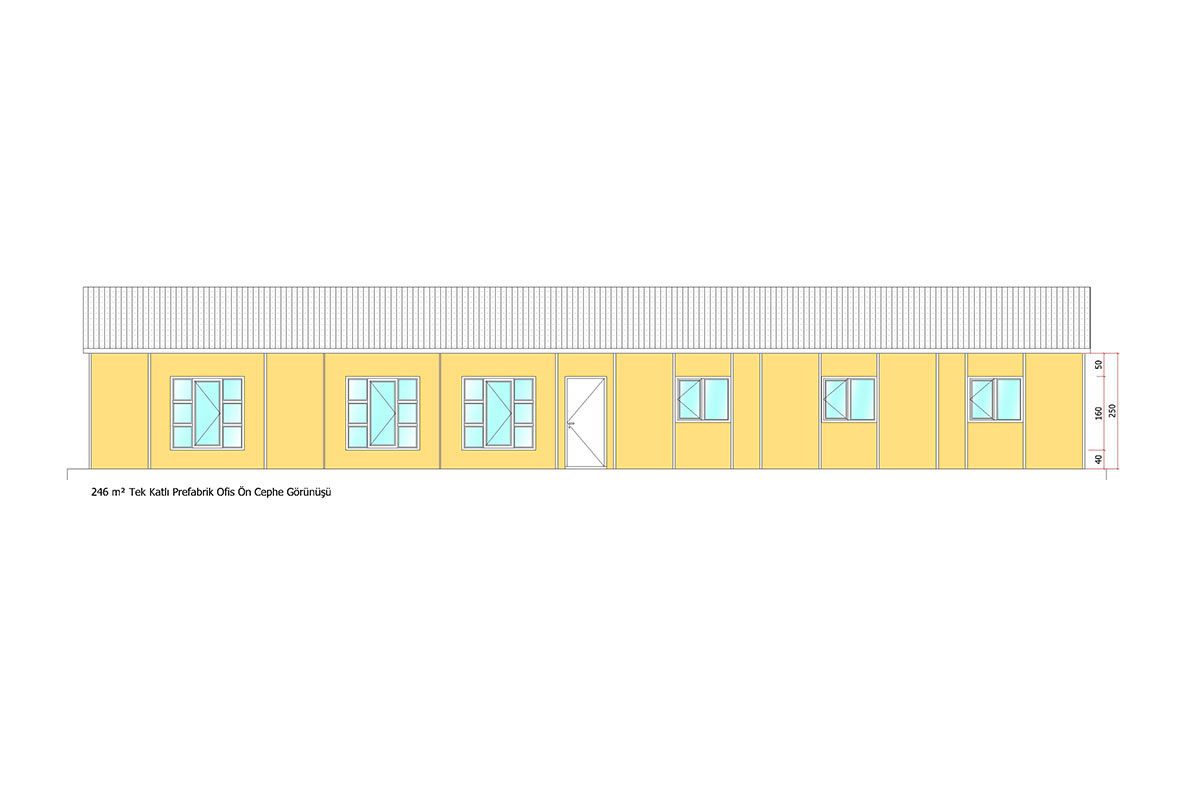 Моделот на префабрикан офис од 246 m² е дизајниран за големи претпријатија и корпоративни компании, нудејќи пространо и модерно работно опкружување. Благодарение на структурата за планирање која обезбедува висока ефикасност, можат лесно да се создадат управни канцеларии, сали за состаноци и отворени работни простори. Системот од издржлива челична конструкција, високата изолациона перформанса и предноста на брзата инсталација го прават ова долготрајно професионално решение за канцеларија.