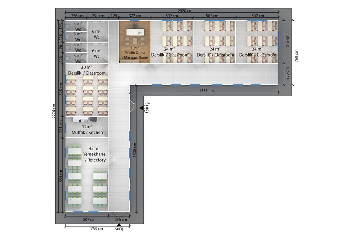 Моделот на префабрикувано училиште од 308 m² нуди широк и ефикасен простор за користење за средно големи образовни проекти. Оваа структура, која е погодна за планирање на повеќе училници, административни канцеларии и заеднички простории, обезбедува практично и економично решение за образовните институции. Со издржлива челична конструкција и високи изолациски карактеристики, нуди безбедна и долготрајна употреба.