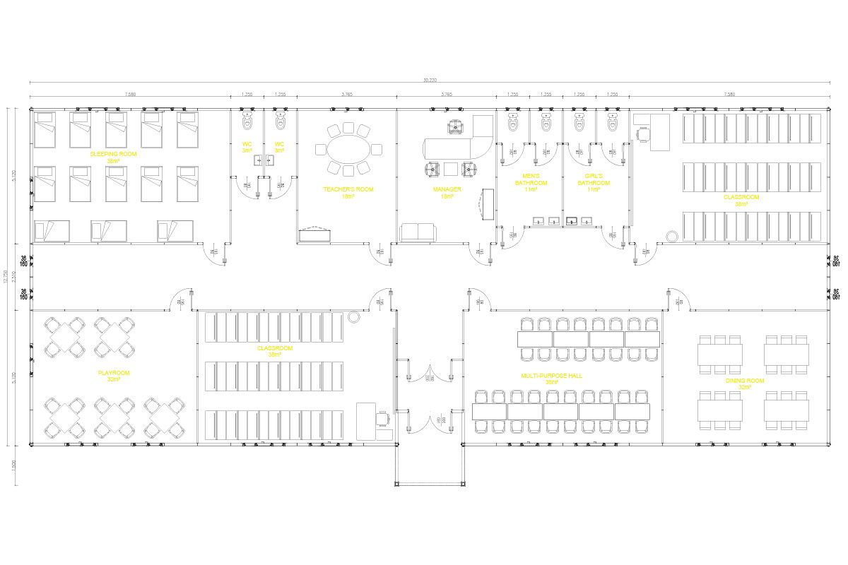 Моделот на префабрикувано училиште од 389 m² нуди широко, функционално и брзо решение за изградба за средни и големи образовни проекти. Обезбедува можност за планирање со повеќе училници, административни простории и заеднички простори, нудејќи практични решенија за потребите на образовните институции. Со издржлива челична конструкција и високи изолациски карактеристики, овозможува долготрајна и безбедна употреба.