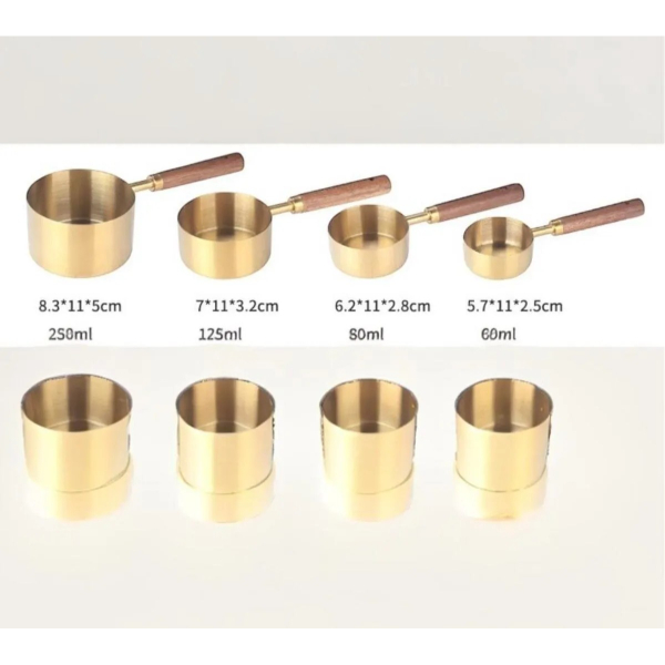 4-лутен сет со мерни лажици со дрвени дршки е идеално решение за мерење во кујната. Металниот дел е во елегантна златна боја, а дрвените дршки се ергономски и овозможуваат удобно користење. Овој сет се состои од 4 мерни лажици во различни големини, што ви помага да добиете точни мерки за секој рецепт.