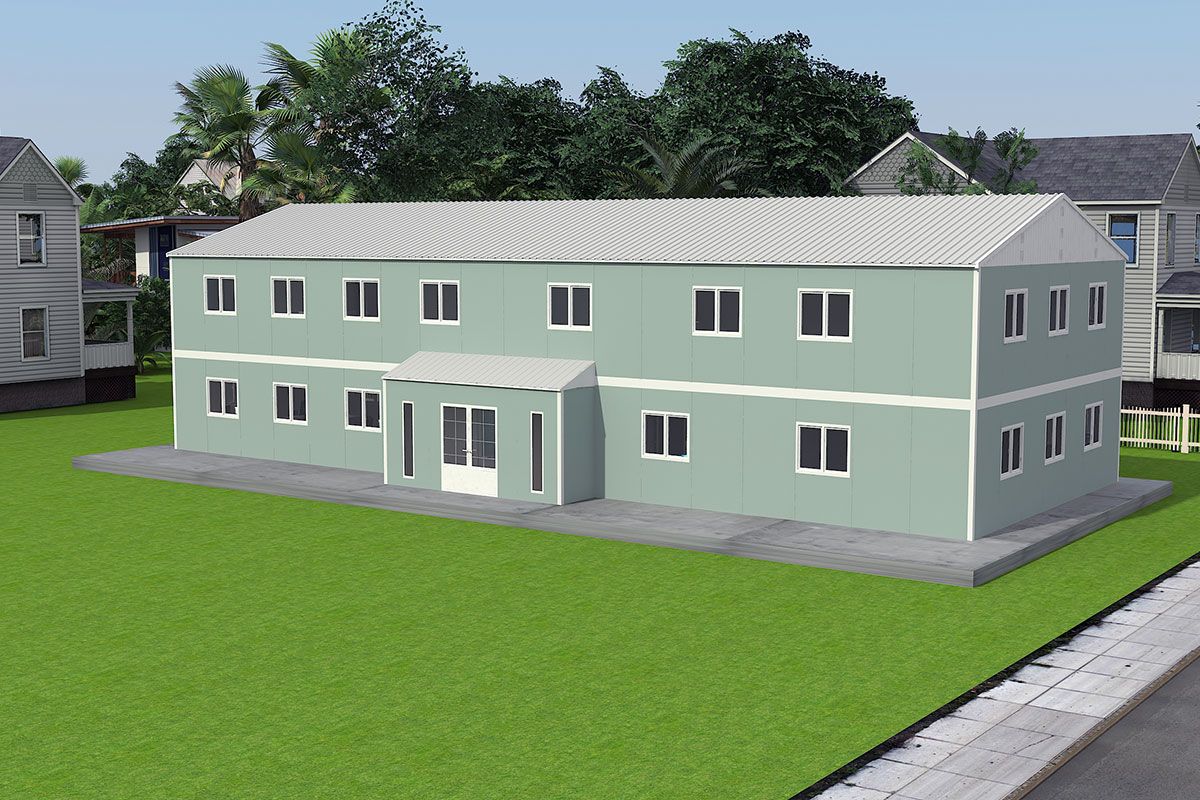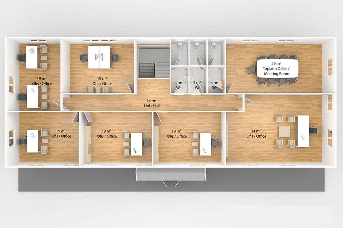 Моделот на двокатна префабрикувана канцеларија од 415 м² нуди пространа и современа работна средина дизајнирана за големи корпоративни структури и бизниси со голем капацитет на персонал. Благодарение на двокатната структура, просторот за користење е максимизиран, овозможувајќи флексибилно планирање за управни канцеларии, сали за состаноци и отворени работни простори. Издржливиот челичен конструкциски систем, високата изолација и брзото поставување го прават ова долготрајно професионално решение за канцеларија.
