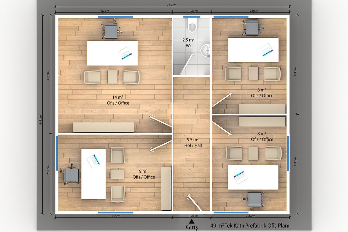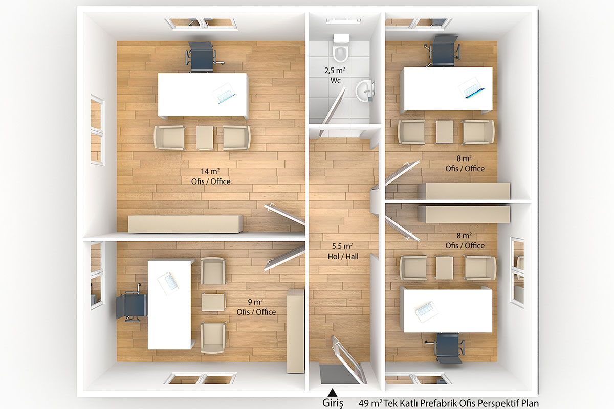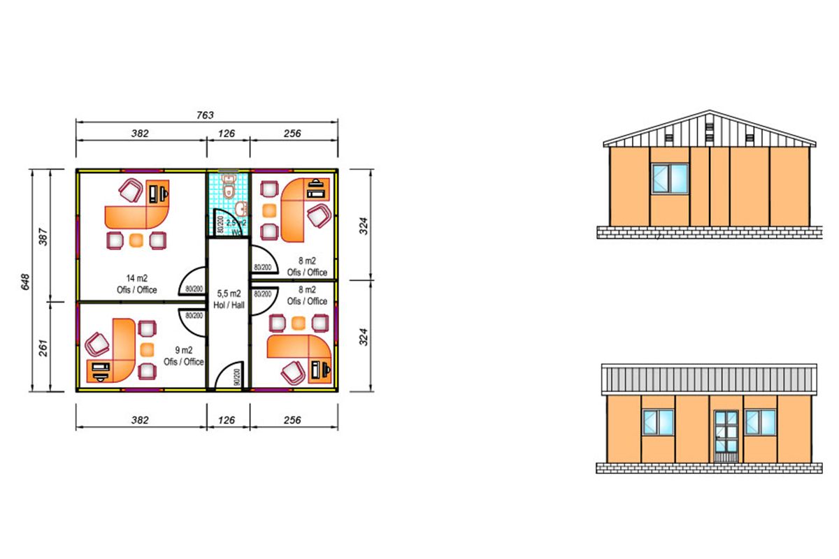 Моделот на префабрикан канцеларија од 49 m² нуди практичен и економичен работен простор за мали и средни претпријатија. Благодарение на компактната структура, може лесно да се користи како канцеларија на градилиште, продажна канцеларија или управен простор. Со својата издржлива структура, брза инсталација и високи изолациски карактеристики, овозможува удобна употреба во сите четири сезони.