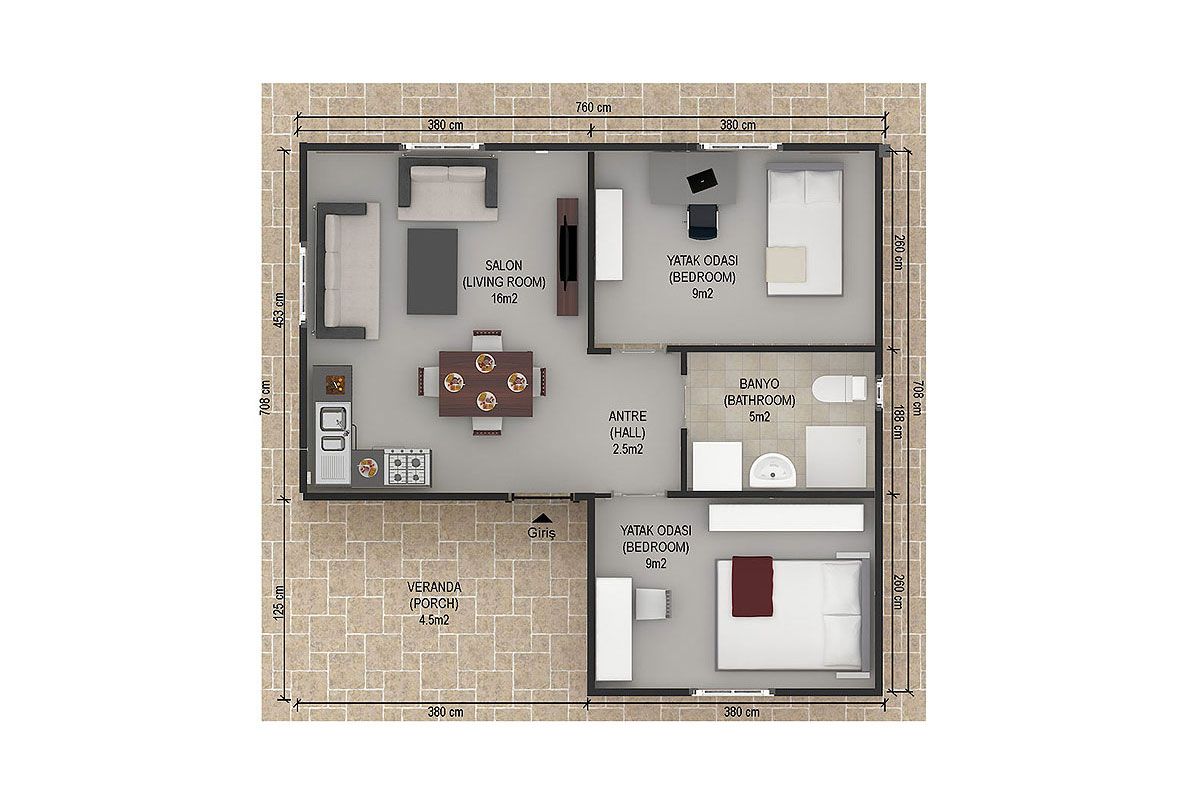Еднокатната префабрикувана куќа од 49 m² нуди компактен но функционален простор за живеење со план 2+1. Благодарение на функционалното распоредување, обезбедува максимална ефикасност на мал простор. Со својот модерен дизајн и практични области за употреба, таа е идеално решение за оние кои преферираат минималистички живот.