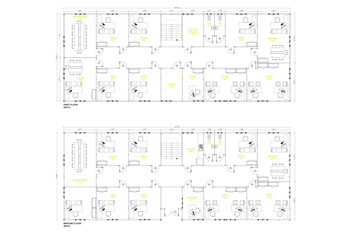 Моделот на двокатна префабрикувана канцеларија од 539 м² нуди високо капацитетен работен простор за големи бизниси и корпоративни компании. Благодарение на двокатната структура, овозможува организирање на различни одделенија во посебни простори, додека пак е идеално решение за управни канцеларии, сали за состаноци и отворени канцелариски планови. Со издржлива челична конструкција, висока изолациона перформанса и предноста на брза инсталација, нуди долготрајна и професионална употреба.
