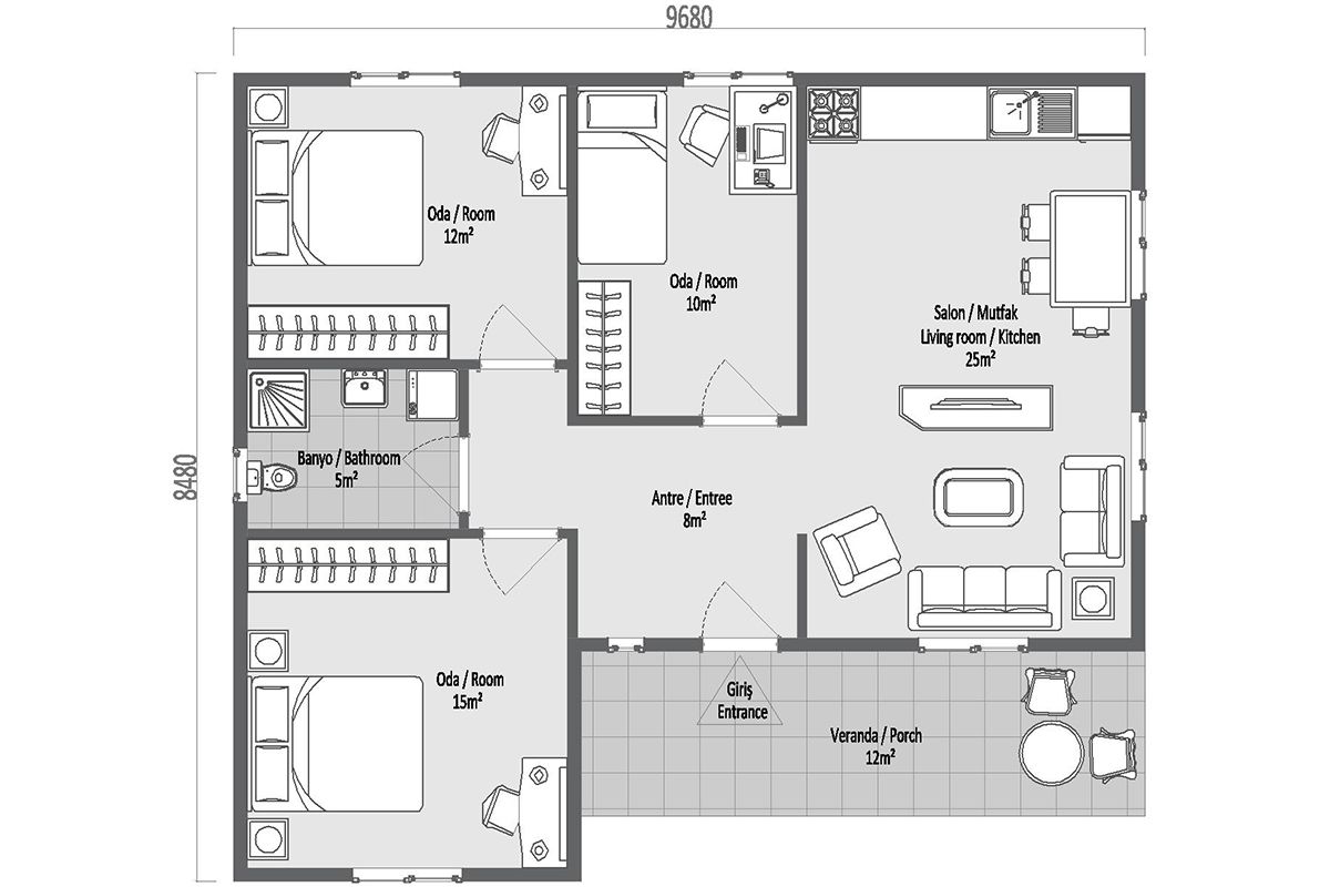 Еднокатната челична префабрикувана куќа со површина од 87 m², со својата пространа и функционална внатрешна структура, нуди удобно решение погодно за семеен живот. Благодарение на издржливиот челичен конструктивен систем, обезбедува долготрајна употреба. Се нуди со подготвена инфраструктура за електрична енергија, вода, тоалет и кујна.
