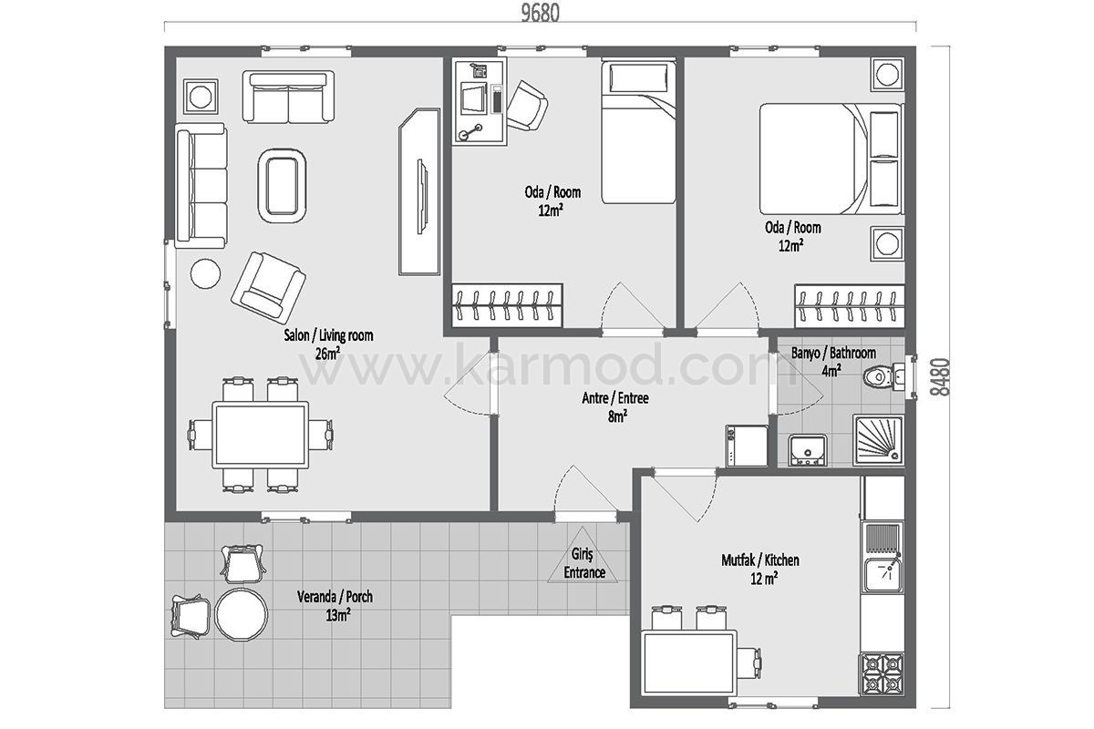 Еднокатната 3+1 челична префабрикувана куќа со површина од 87 m² е идеално решение за домување за семејства, со пространа и функционална животна површина. Благодарение на цврстата челична конструкција, таа е долготрајна. Понудена е со подготвена инфраструктура за електрика, вода, тоалет и кујна.
