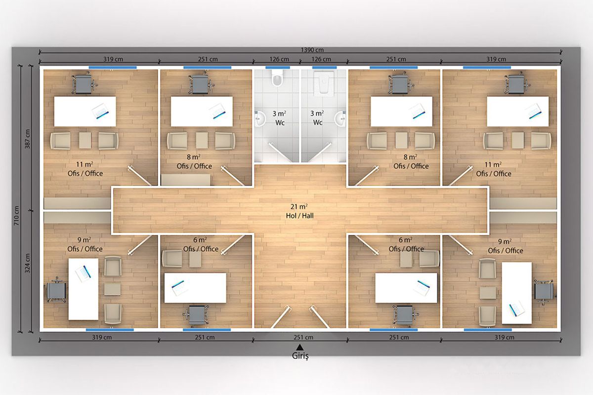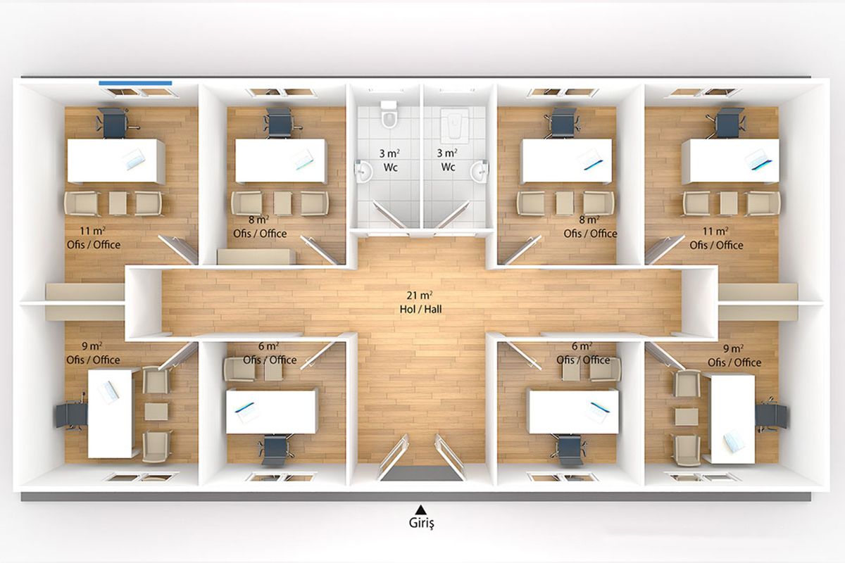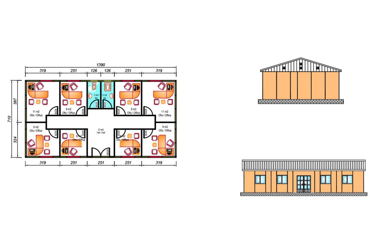Моделот префабрикан канцеларија од 98 m² нуди пространа, модерна и функционална работна средина за средни претпријатија. Благодарение на практичниот внатрешен план, канцеларијата може лесно да се користи како управна зграда на градилиште или продажна канцеларија. Со издржлива челична конструкција, високи перформанси на изолација и предност на брза инсталација, обезбедува долготрајна употреба.