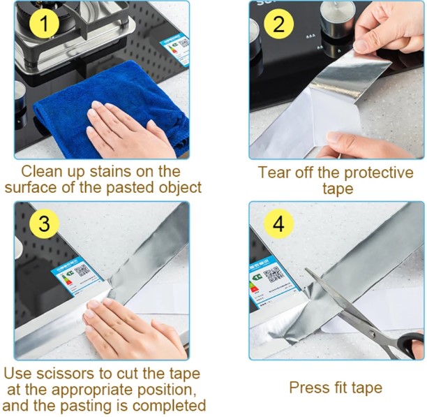 Алуминиумска Вода Непропустлива Лента е идеална за заштита на работни површини во кујната и бањата. Оваа самозалеплива лента може да се прилагоди според вашите потреби, а нејзините својства обезбедуваат силна непроникливост и отпорност на маснотии и мувла.