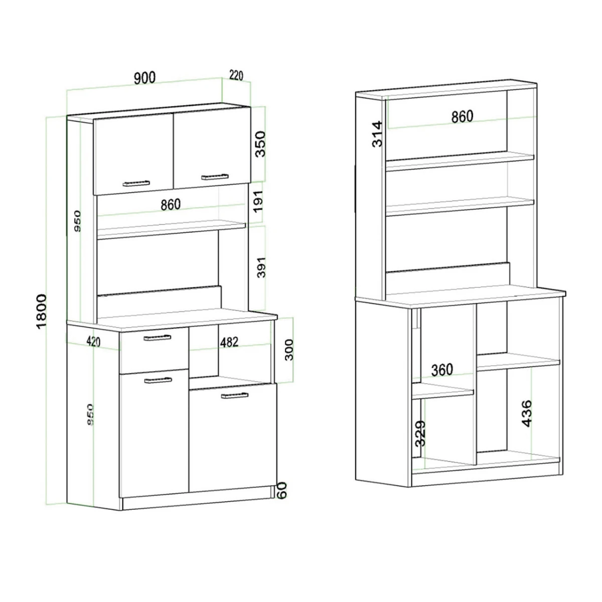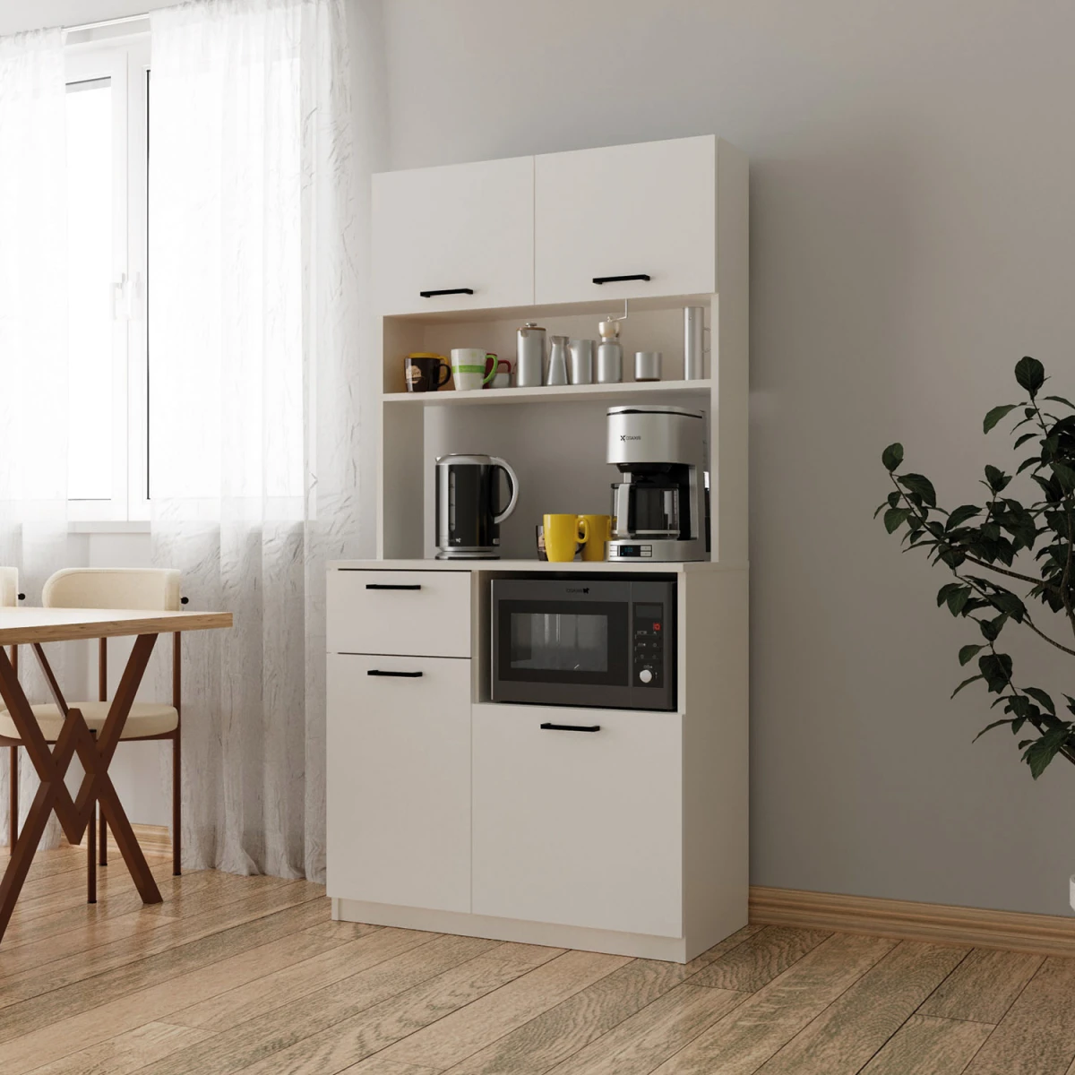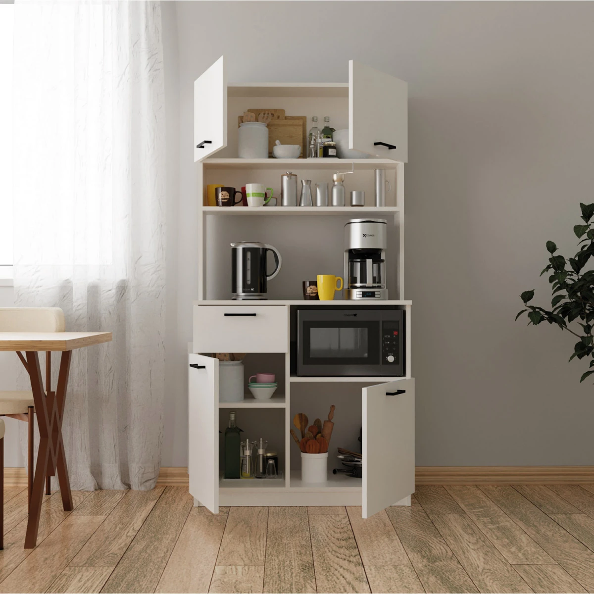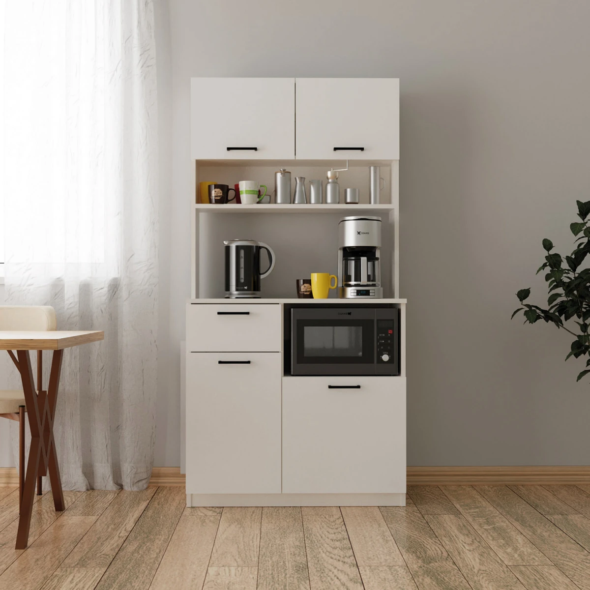 Arya Кафе Агол Мултифункционален Ормар е дизајниран за уредно поставување на кафе машина, чаши, тегли и други кујнски предмети во кујна, дневна соба, канцеларија или кафе. Со својата бела боја обезбедува модерен и елегантен изглед.