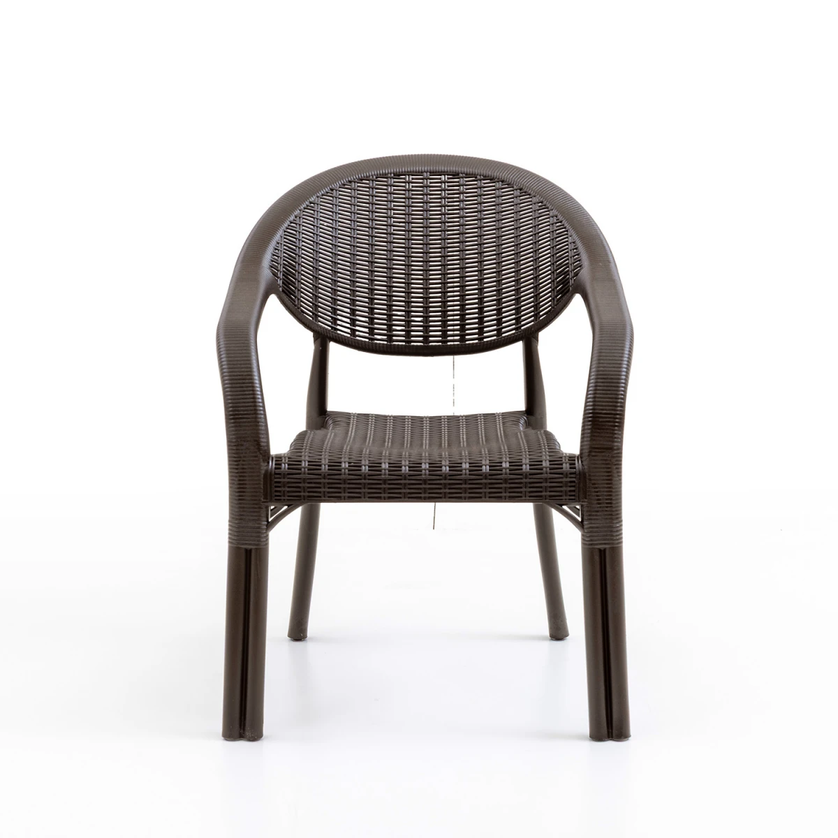 Комплетот од столчиња во кафеава боја со елегантен изглед на ратан е изработен од издржлив полипропилен материјал и е погоден за надворешна употреба. Обезбедува удобност со широкото седиште и ергономскиот дизајн. Лесно се чисти и се испорачува како комплет од 4 столчиња.