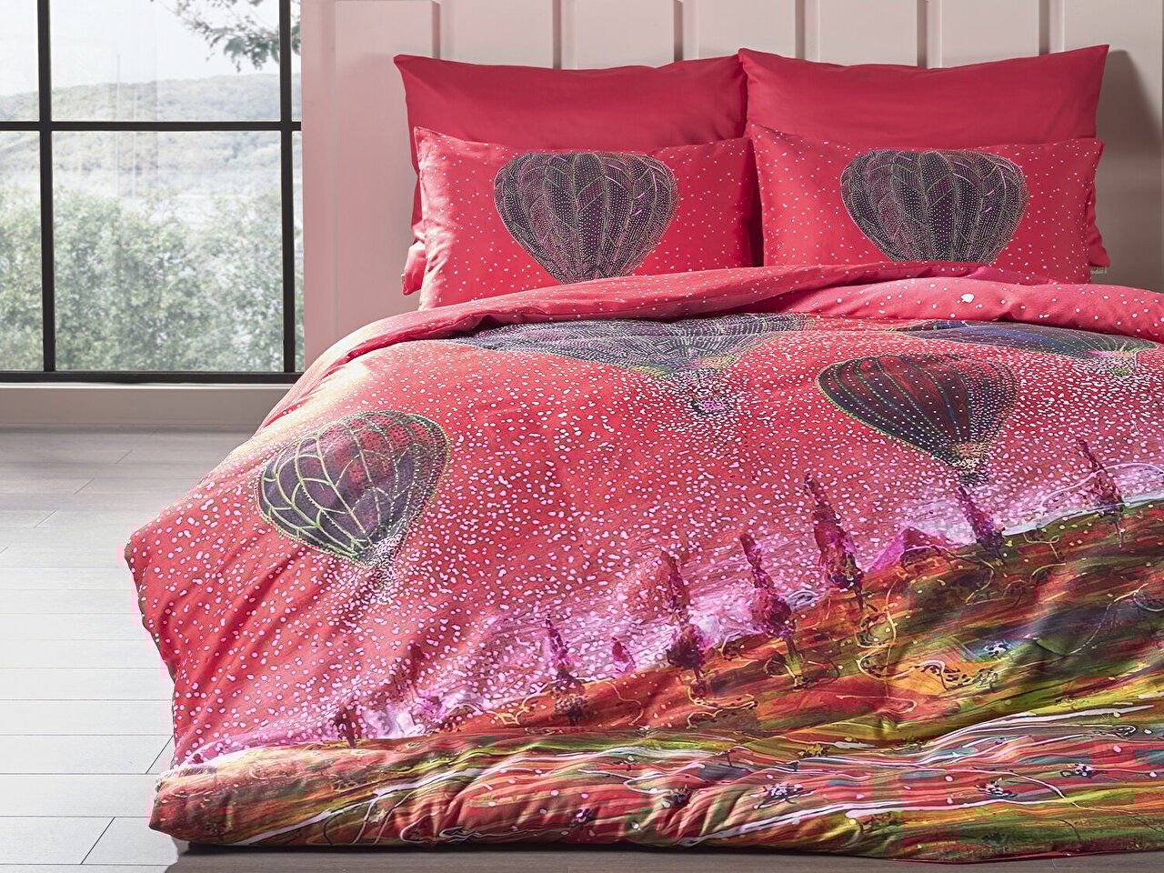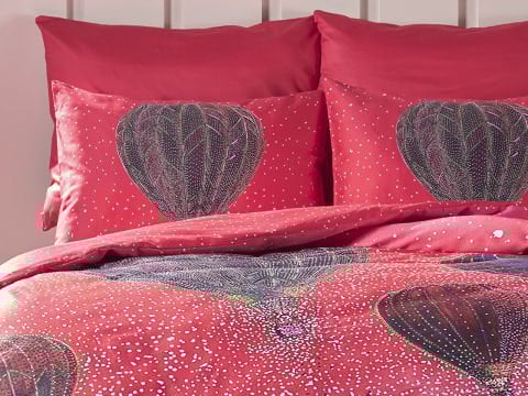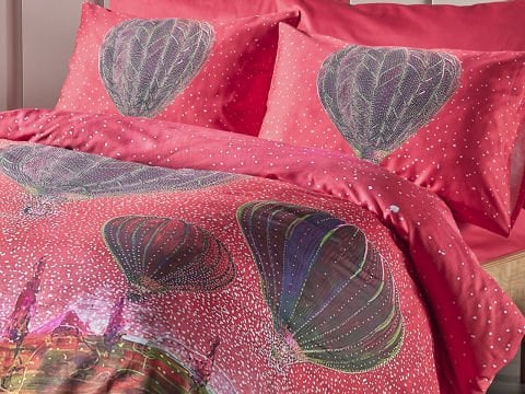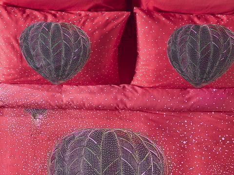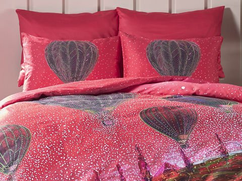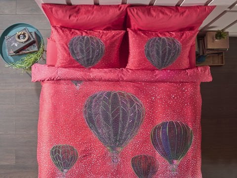 Овој единечен сет постелнина, произведен од 100% памучна ткаенина, со сатенска ткаенина и густина од 53 нишки, нуди елегантна и удобна употреба со својата живописна црвена боја.
