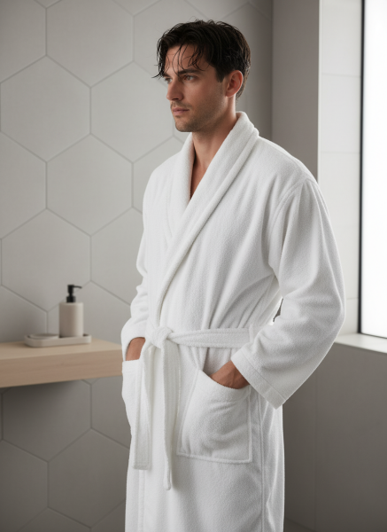 Бањарката со шал јака во бела боја, која се истакнува со својата мека текстура и висока апсорпција, нуди удобна и топла употреба по бањање. Благодарение на 100% памучната текстура, таа е пријателска за кожата, не предизвикува потење и е долготрајна. Идеална е за користење во домот, спа и хотели.