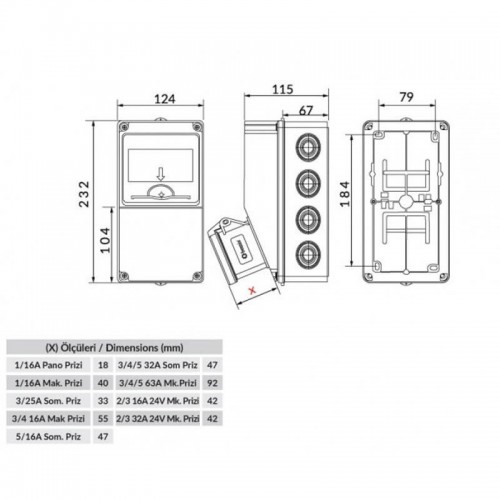 | 1 Приклучок, 380V, 3/25A, 50Hz-60Hz, 3P+E | 2 Приклучоци, 220V, 1/16A, 50Hz-60Hz, 2P+E |