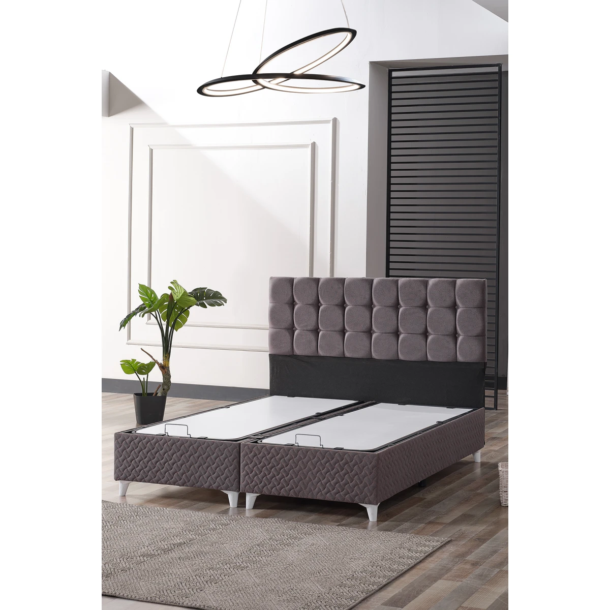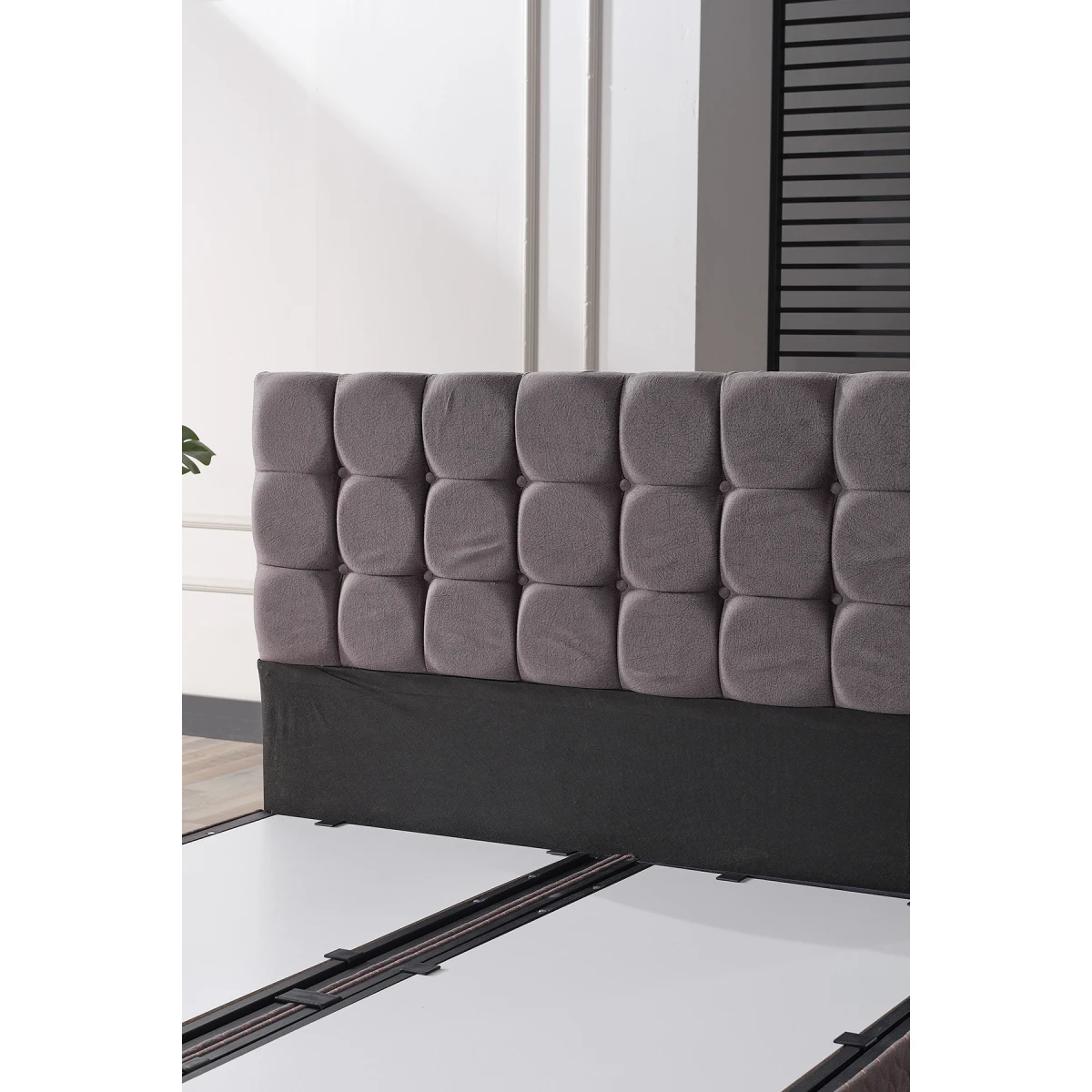 Бенгю Комплет за Двојен легло и Наслон, со својот модерен сив изглед и цврста конструкција, му дава елегантен и функционален изглед на вашата спална соба. Благодарение на издржливата метална рамка на подлогата и удобниот наслон, овозможува долготрајна и удобна употреба.