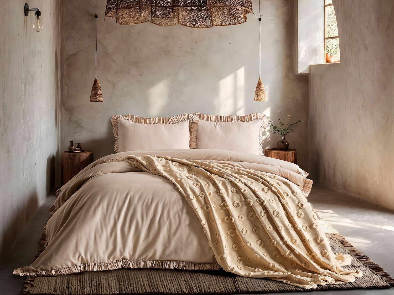 Bonivia bohem постелнината со нејзиниот топол изглед во визон нијанса додава природен и елегантен амбиент во спалната соба. Нејзината мека текстура обезбедува удобен сон.