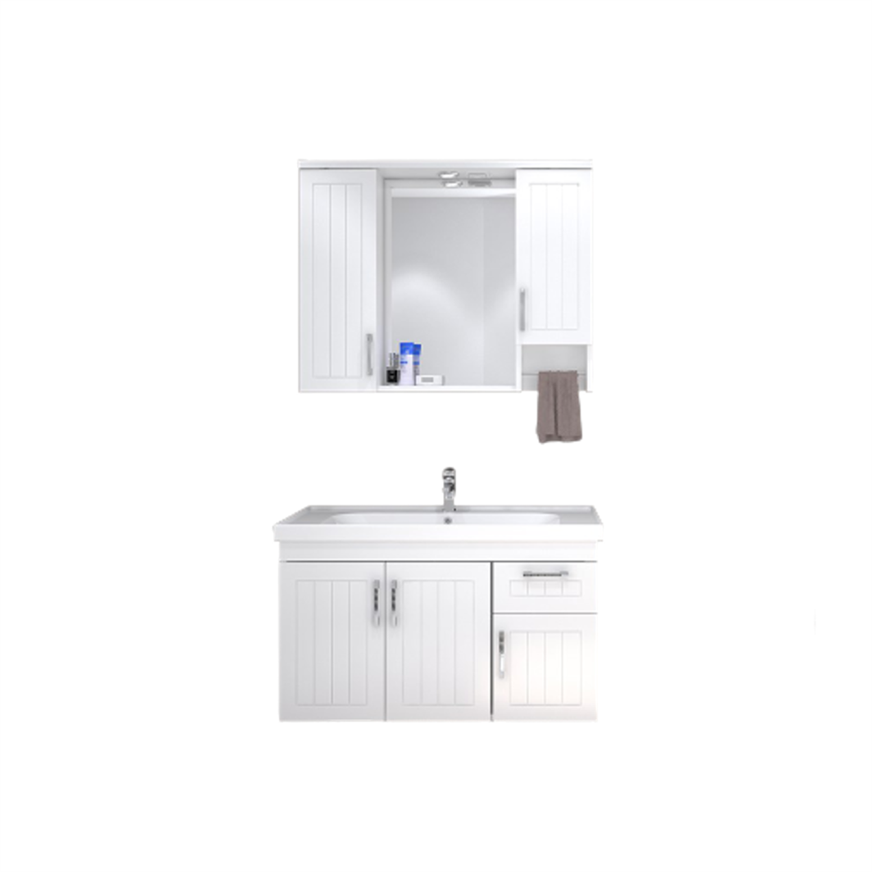 DENKO Лотус 100 цм МДФ Бања Комплет, со својата блескава бела површина и модерни линии, му додава свеж и шик изглед на бањата. Корпусот е изработен од МДФ Лам, а вратите се покриени со блескава бела лак боја. Системот на френски чекор и вратите обезбедуваат тивко и безбедно користење. Интегрираната LED светлина додава естетика и функционално светло во вашиот бања. Комплетот е завршен со хигиеничен и издржлив керамичен умивалник. Бојната вообичка не е вклучена во производот.