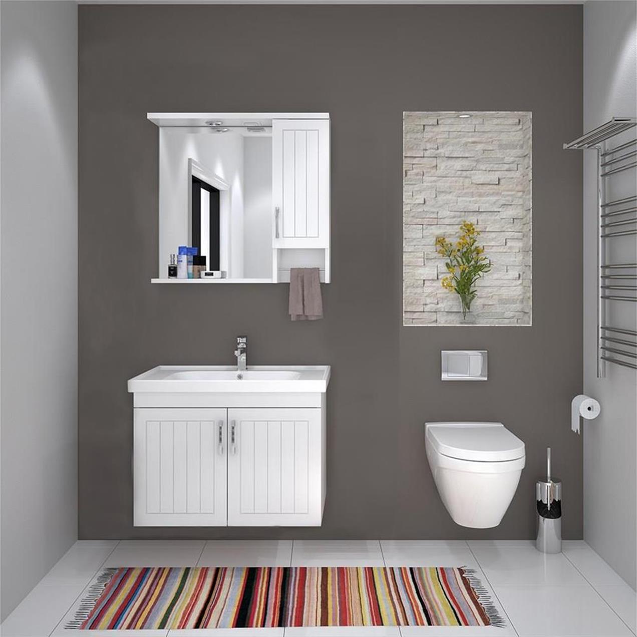 ДЕНКО Лотус 80 цм Бања Гарнитура, со својата бела боја и модерен дизајн, му дава естетска појава на вашата бања. Корпусот е изработен од бел МДФ лам, капаците се од МДФ лам и се завршени со серамичен лавабо. Функционален дизајн што обезбедува лесна употреба.