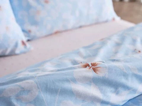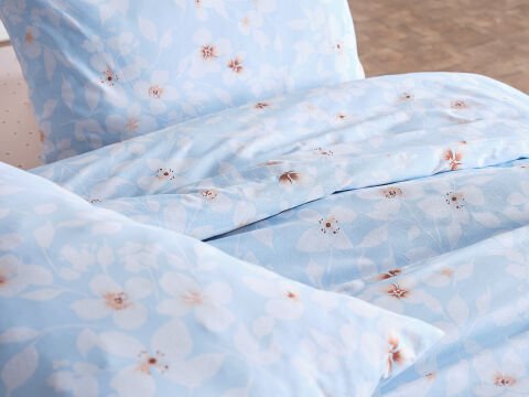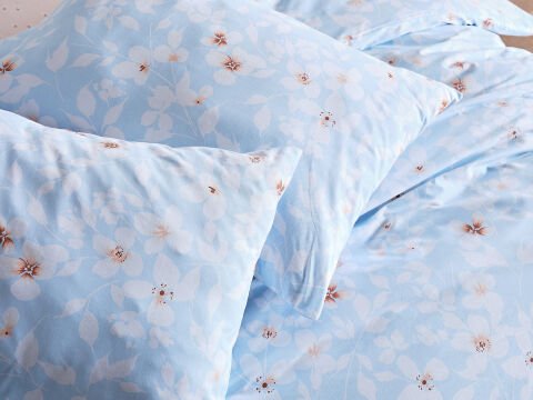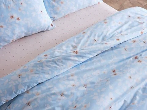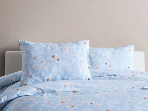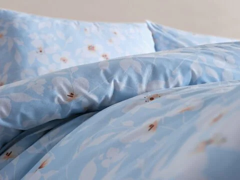 Син постелен комплет со цветен дезен за двоен кревет. Удобен, стилски и додава естетика на вашата спална соба.