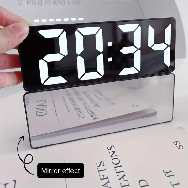 Дигитален Сат со Сензор за Звук и Аларм нуди лесно читање на времето со големи и јасни цифри. Кога предната површина е затворена, создава елегантен изглед со огледален ефект.