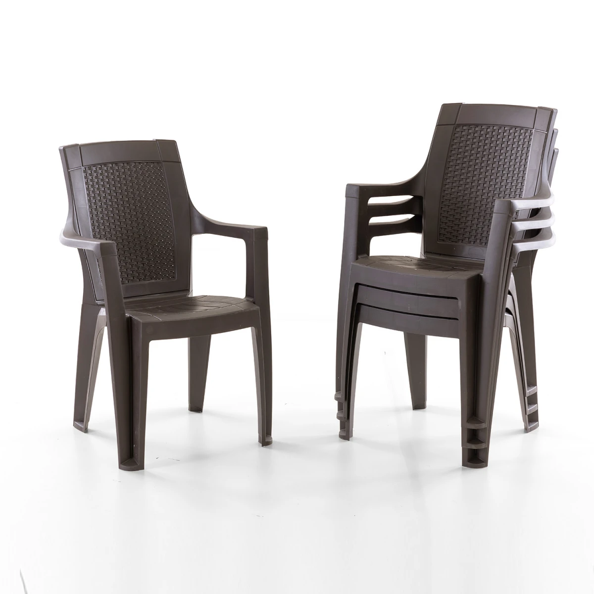Елегантен сет од кафеави столчиња со изглед на ратан, изработени од издржлив полипропилен материјал, погодни за надворешна употреба. Обезбедуваат удобно седење и лесни се за чистење. Сетот се испраќа со 4 столчиња.