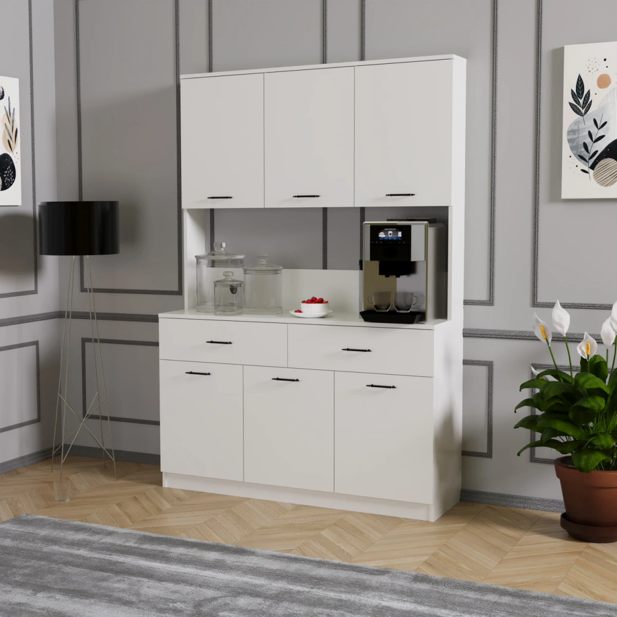 Дијамант Мултифункционален Орман за Кафе Агол е дизајниран за уредно поставување на апарат за кафе, чаши, тегли и разни кујнски додатоци во кујната, дневната соба, канцеларијата или кафулето. Со својата бела боја и модерен дизајн, му дава свеж и елегантен изглед на просторот каде што се наоѓа.