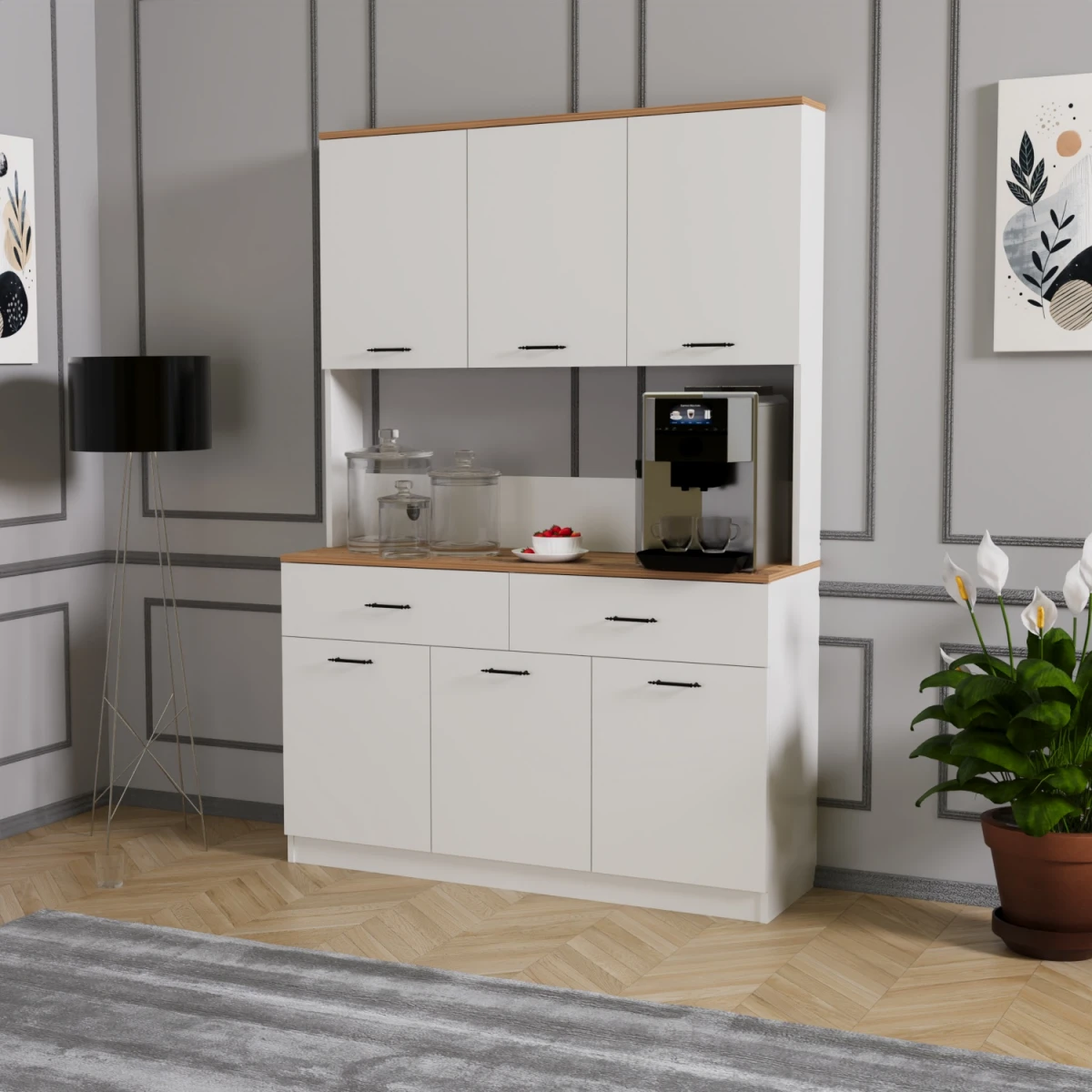Елмас Мултифункционален Ормар за Кафе Агол е дизајниран за уредно поставување на апарат за кафе, шолји, тегли и други кујнски предмети во кујна, дневна соба, канцеларија или кафе простор. Комбинацијата на боите бор и бела му дава топол и модерен изглед на околината.